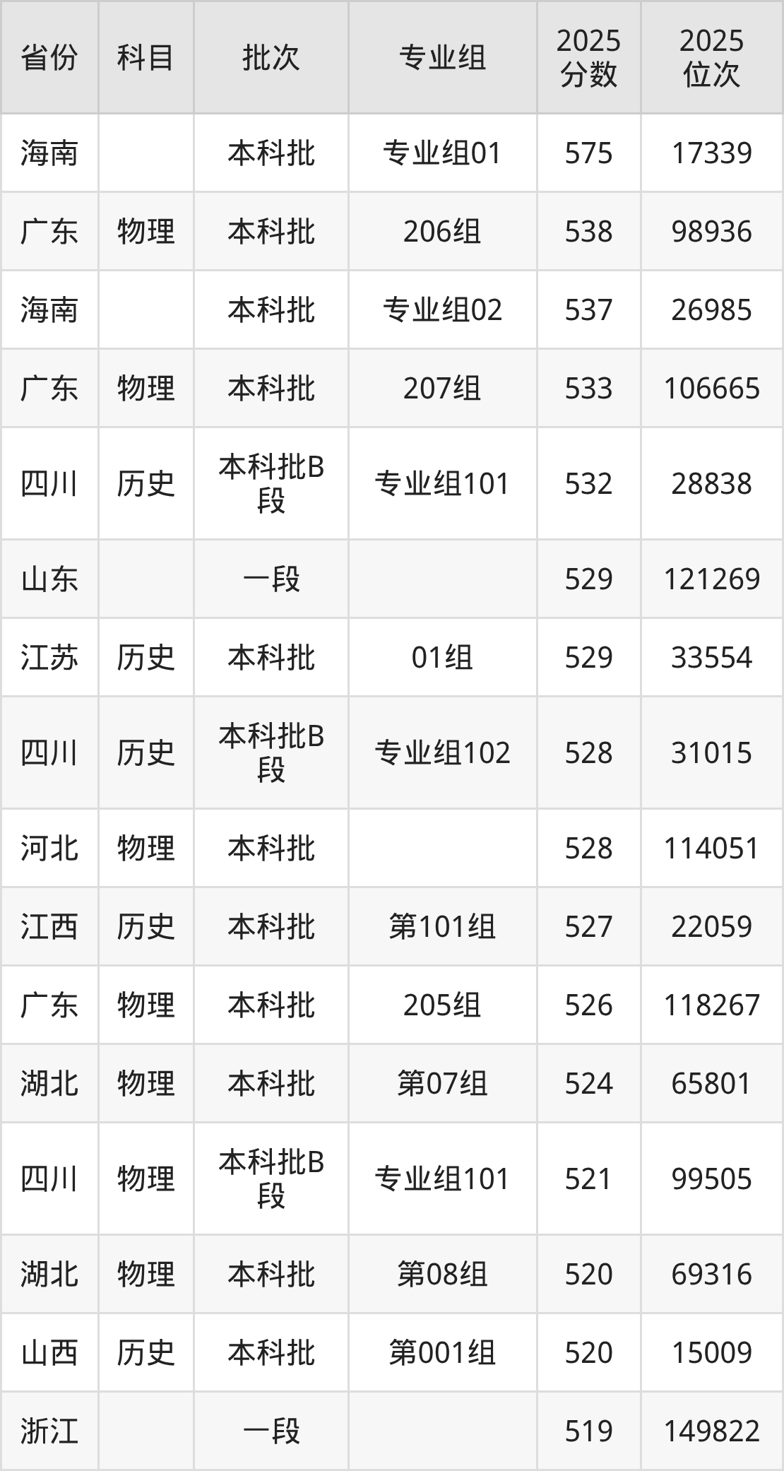 2025年湖北科技学院全国录取分数线348分到575分,录取最高在海南(专业组01)、录取最低在新疆(理科)。