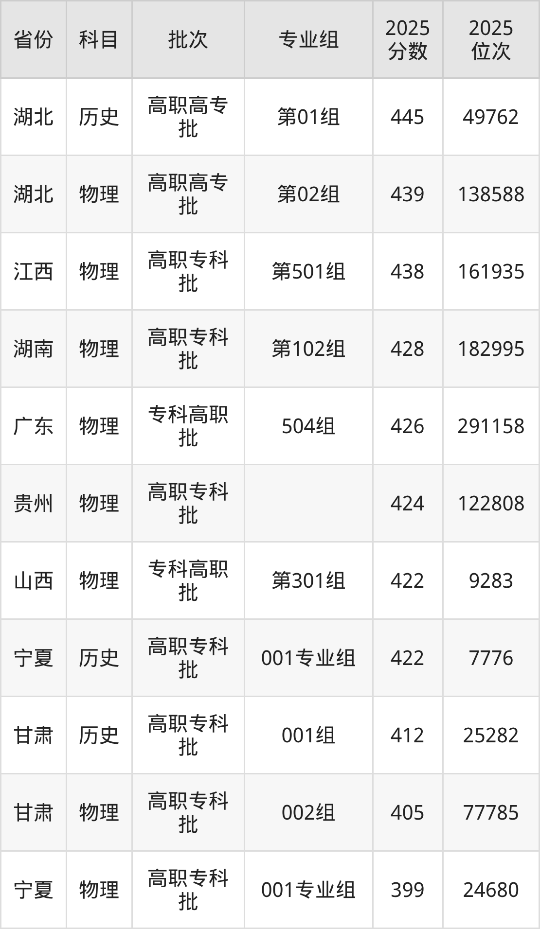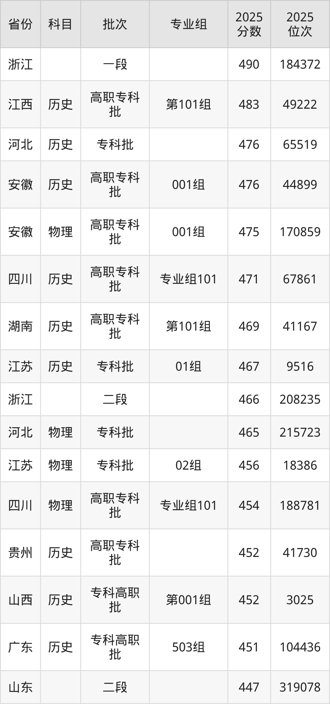 2025年南京机电职业技术学院全国录取分数线399分到490分,录取最高在浙江、录取最低在宁夏(001专业组)。