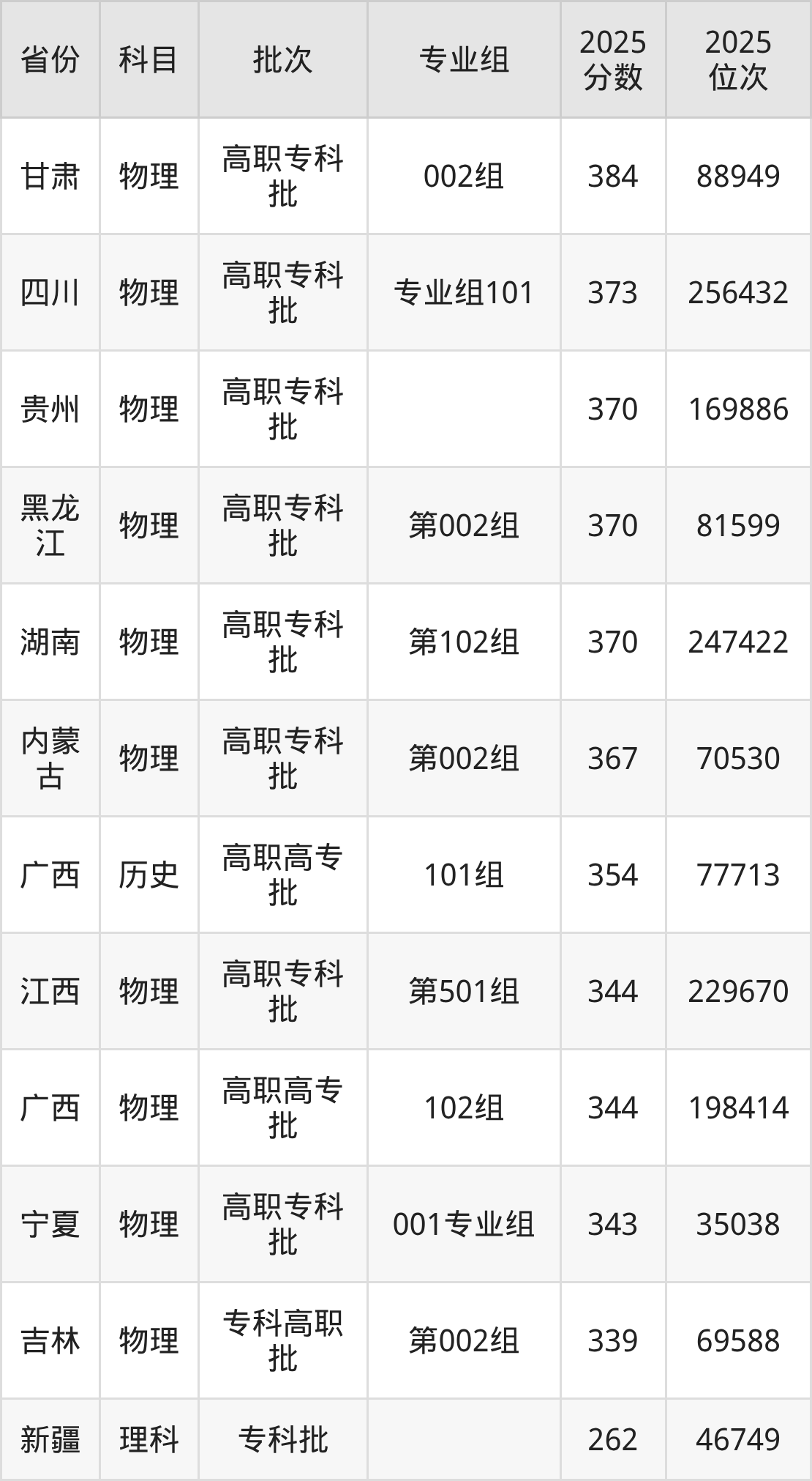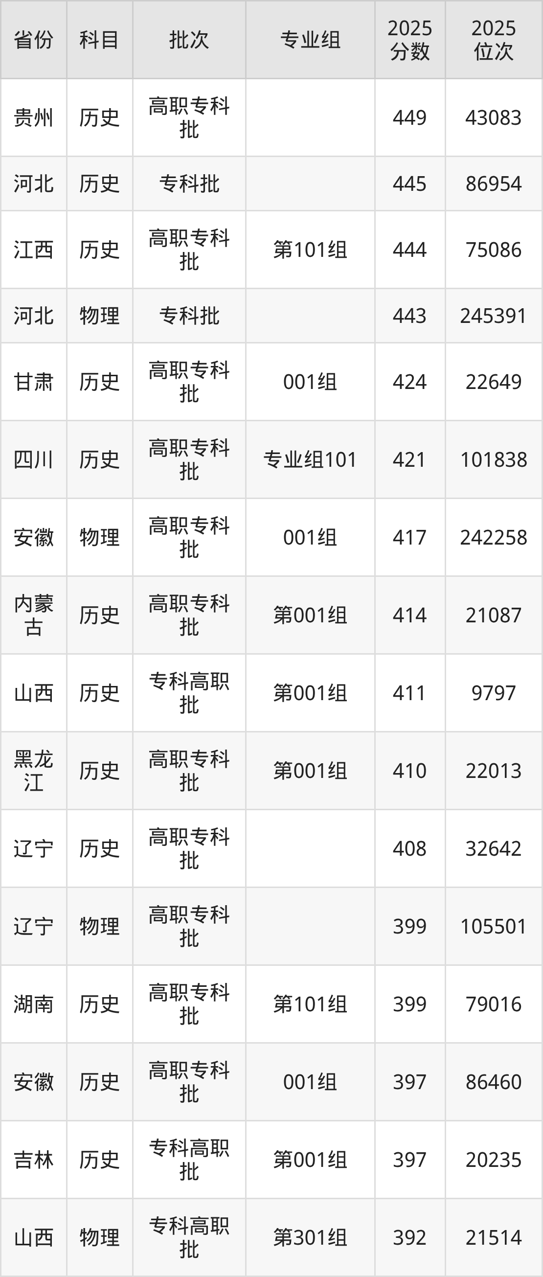 2025年辽宁医药职业学院全国录取分数线262分到449分,录取最高在贵州(历史)、录取最低在新疆(理科)。