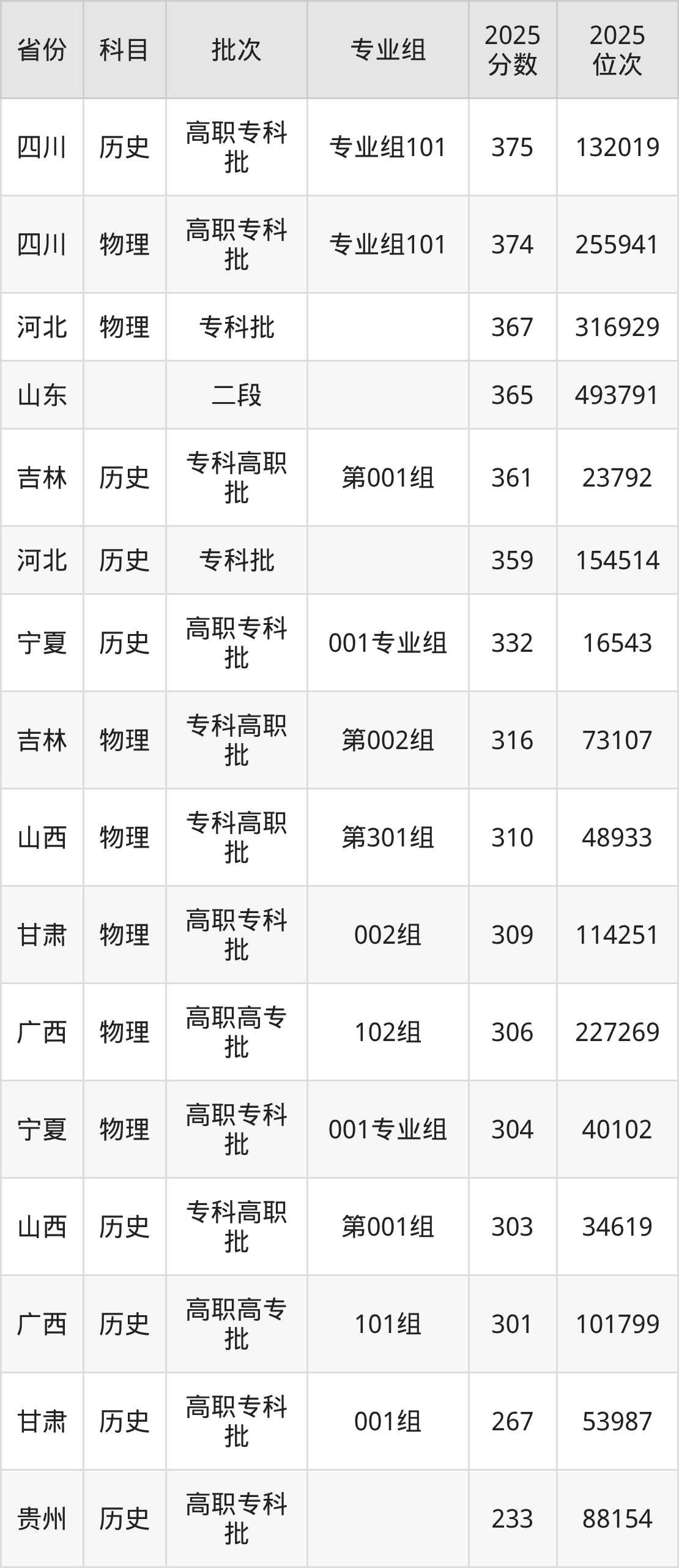 2025年宣化科技职业学院全国录取分数线230分到375分,录取最高在四川(专业组101)、录取最低在贵州(物理)。