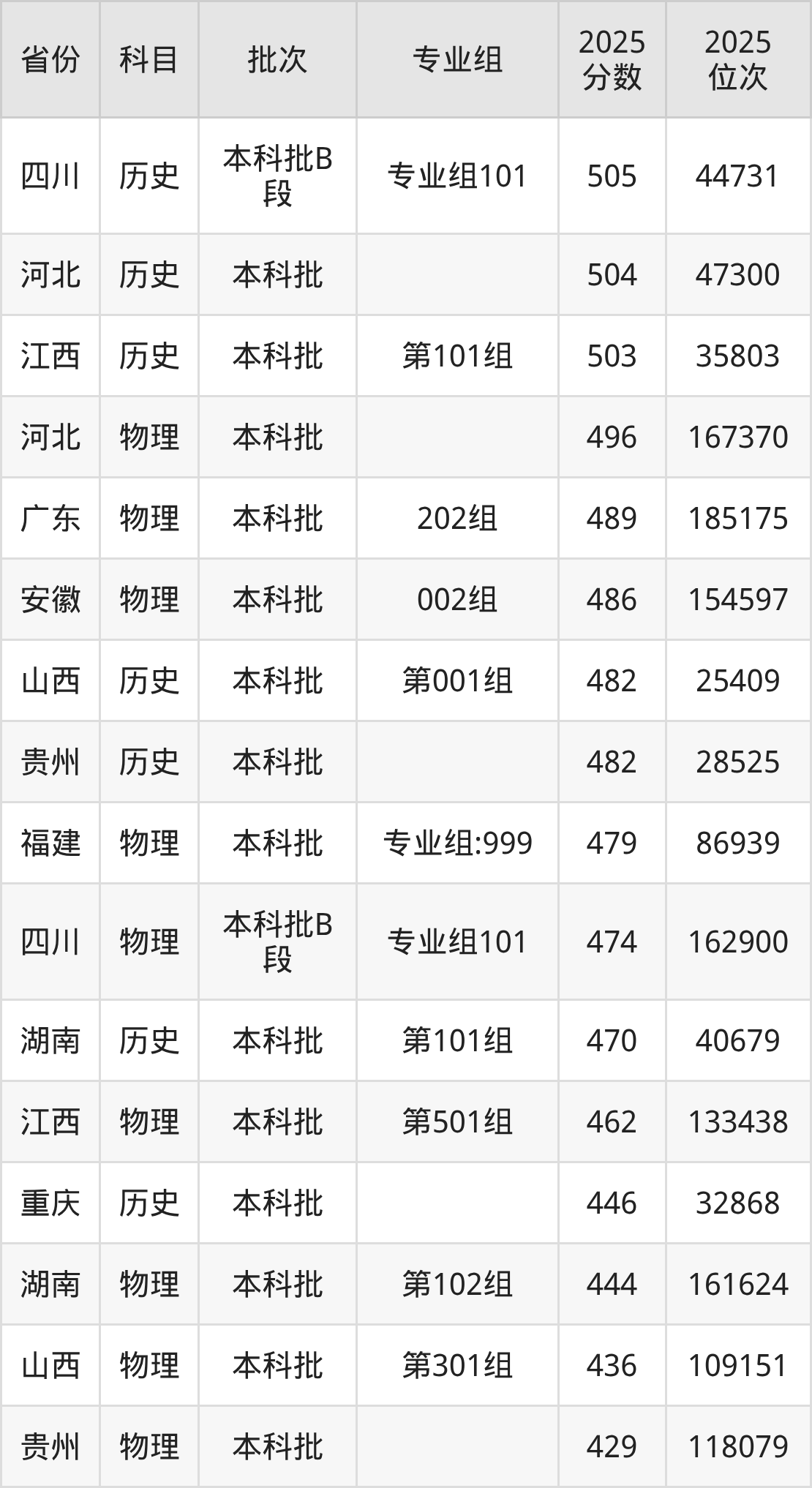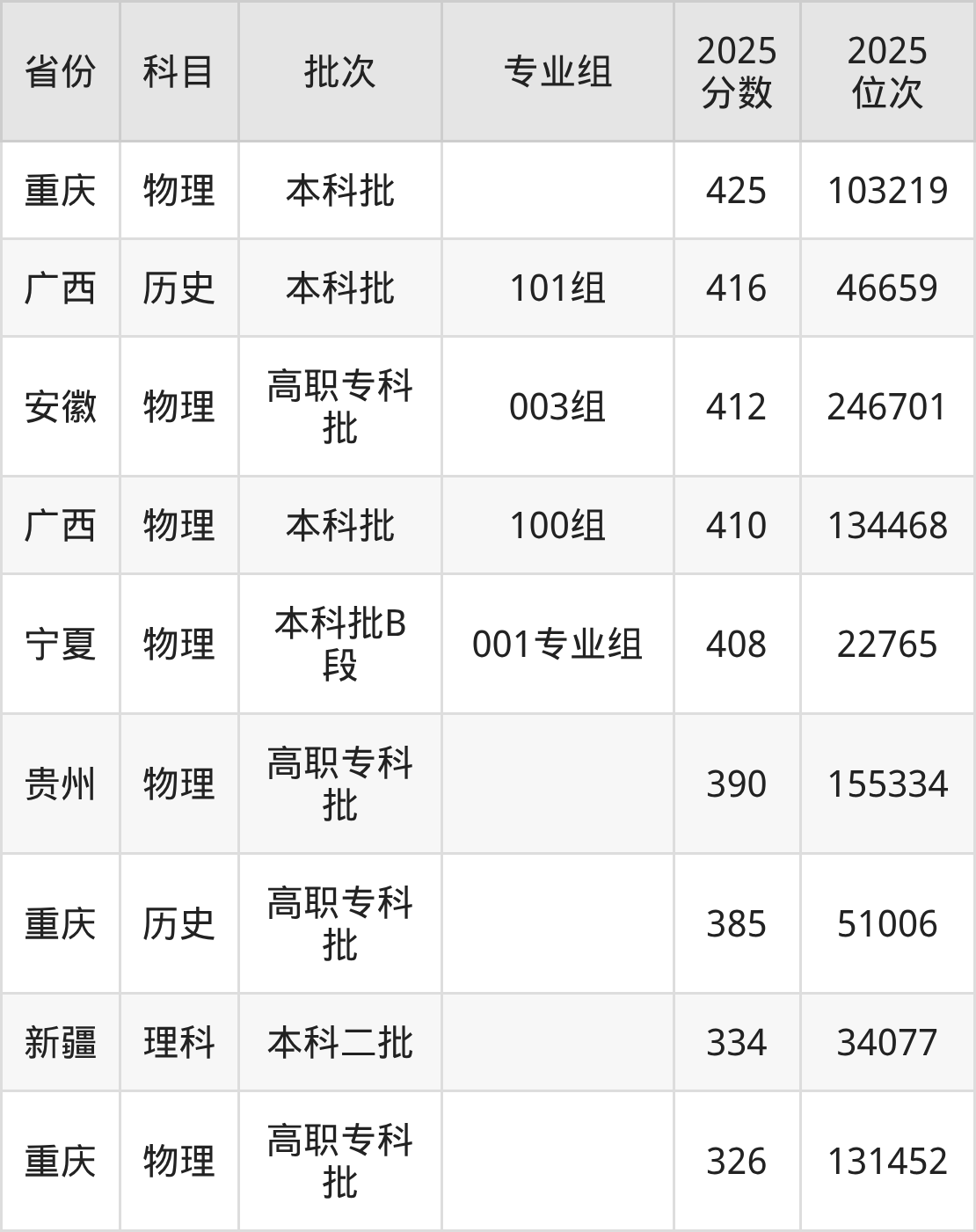 2025年重庆机电职业技术大学全国录取分数线326分到505分,录取最高在四川(专业组101)、录取最低在重庆(物理)。