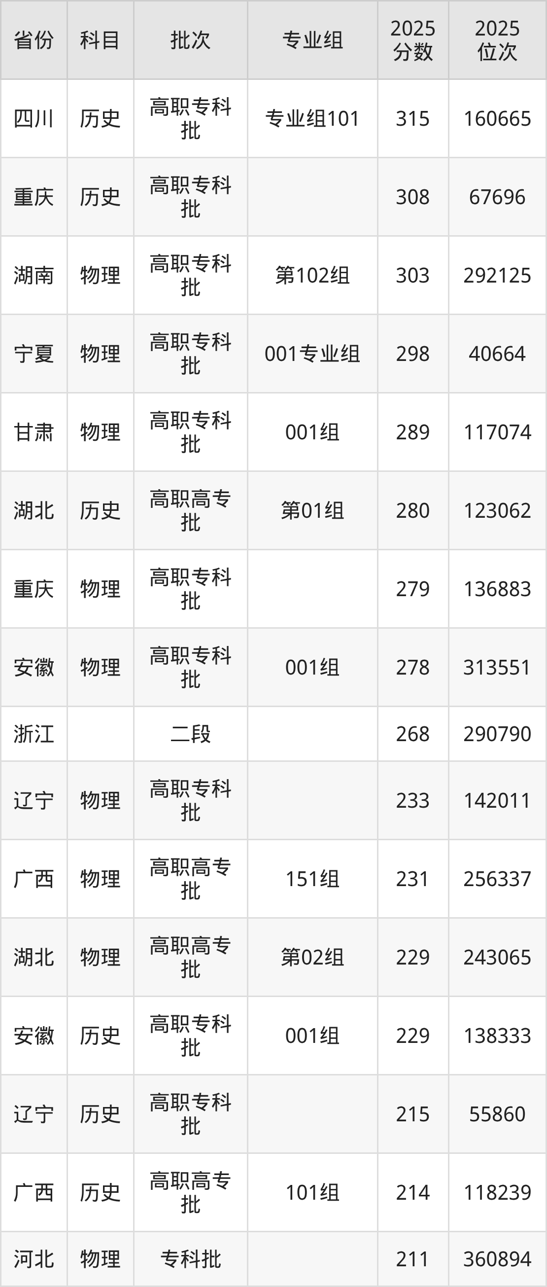 2025年重庆电信职业学院全国录取分数线150分到315分,录取最高在四川(专业组101)、录取最低在四川(专业组101)。