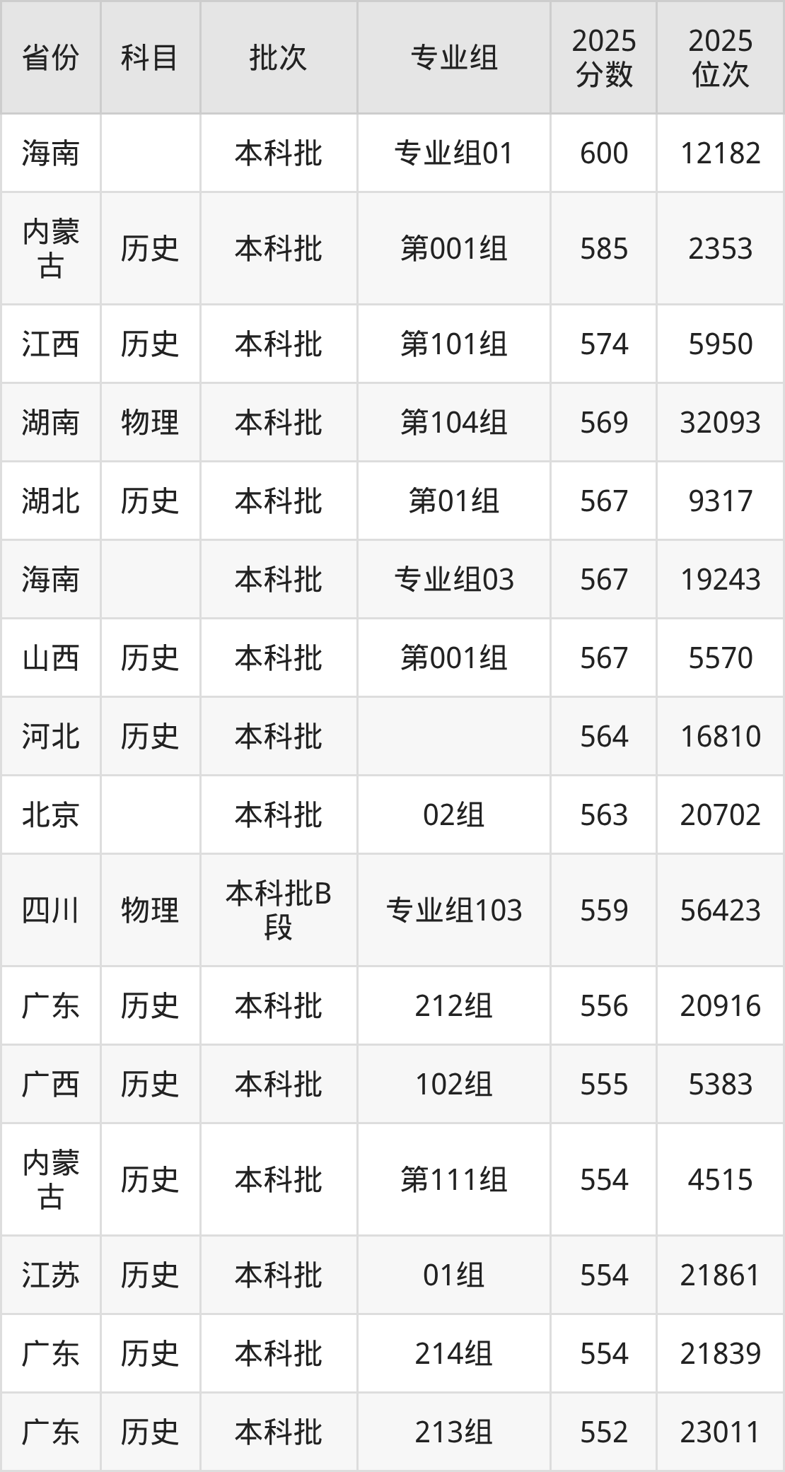 2025年南华大学全国录取分数线385分到600分,录取最高在海南(专业组01)、录取最低在吉林(第003组)。