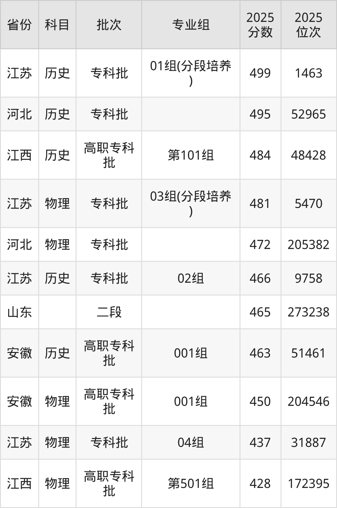 2025年苏州经贸职业技术学院全国录取分数线428分到499分,录取最高在江苏(01组(分段培养))、录取最低在江西(第501组)。