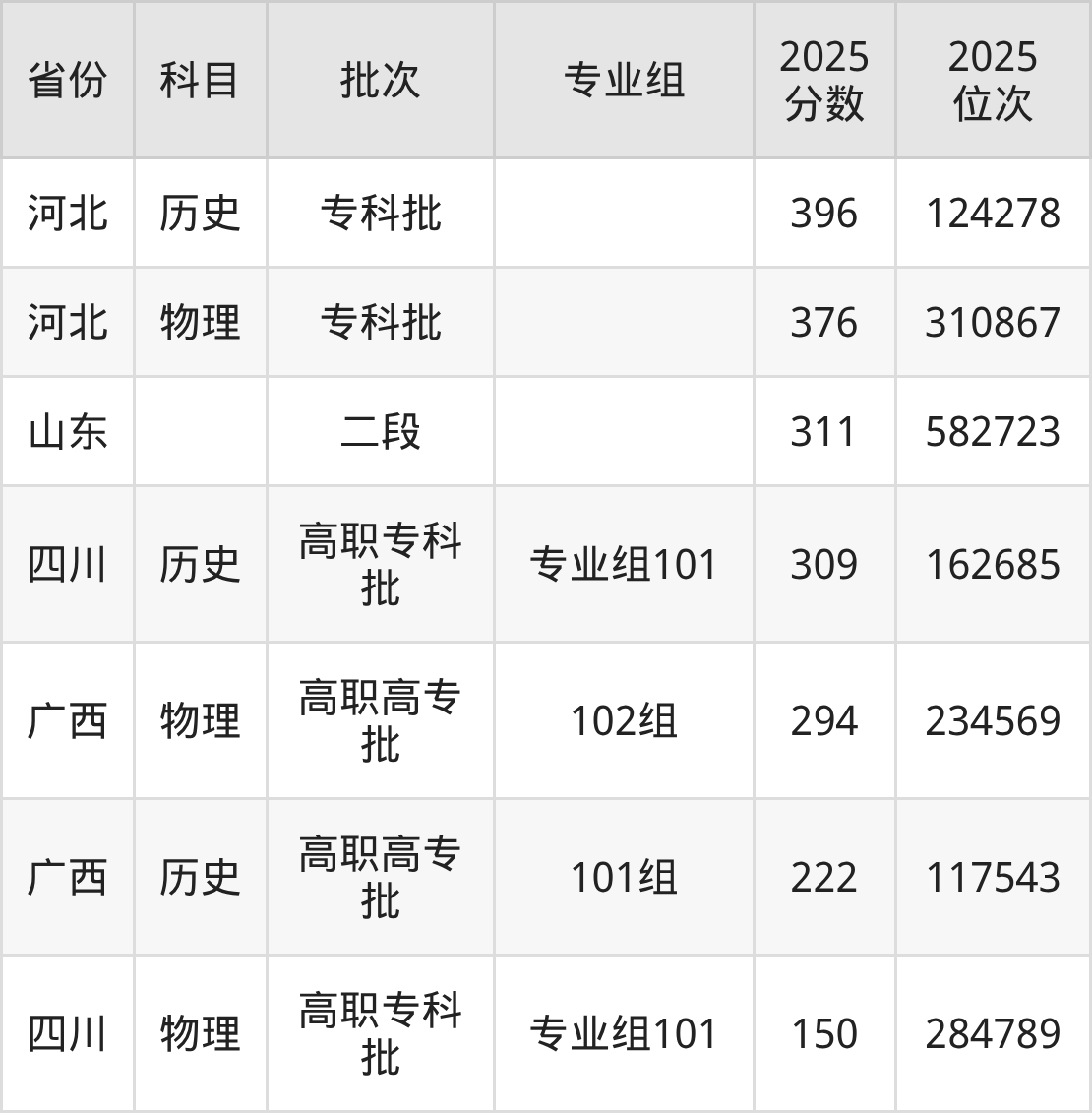 2025年驻马店职业技术学院全国录取分数线150分到396分,录取最高在河北(历史)、录取最低在四川(专业组101)。