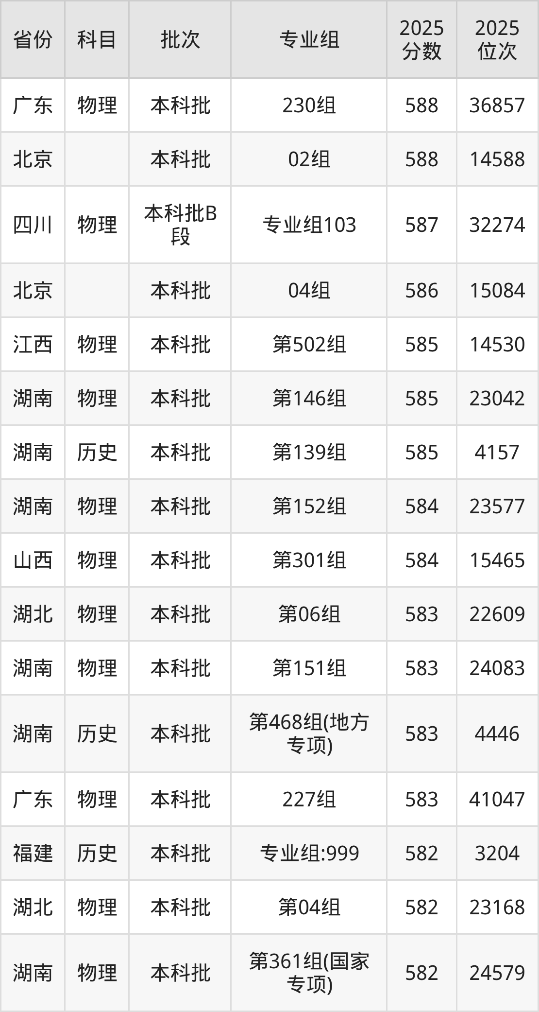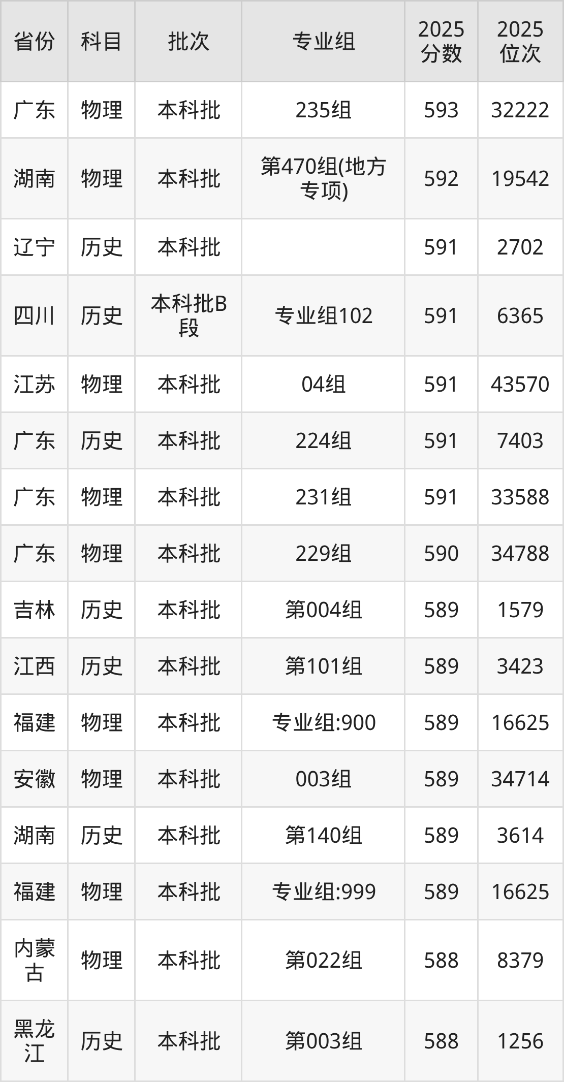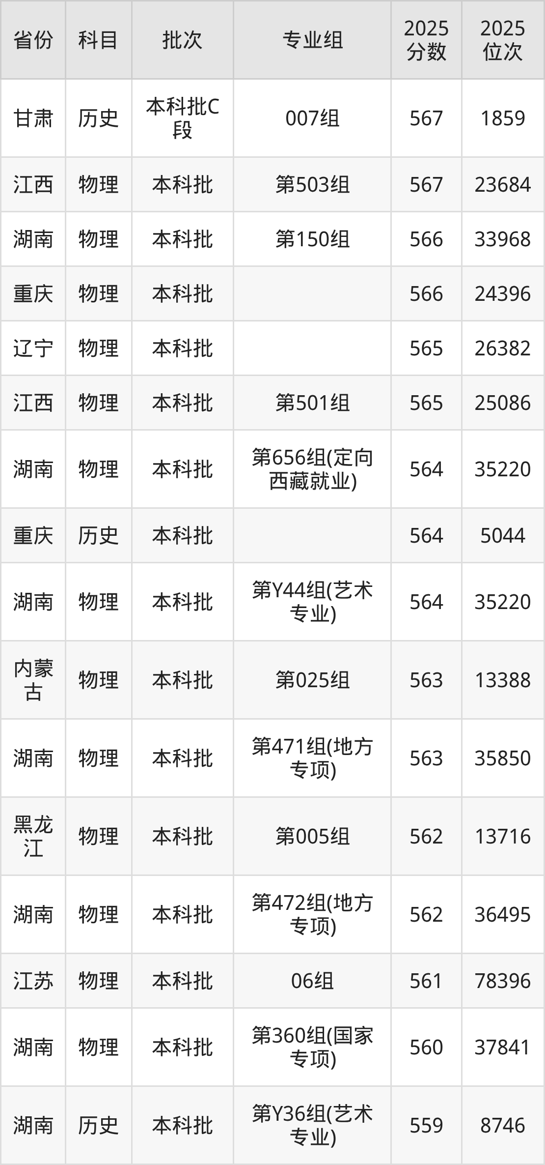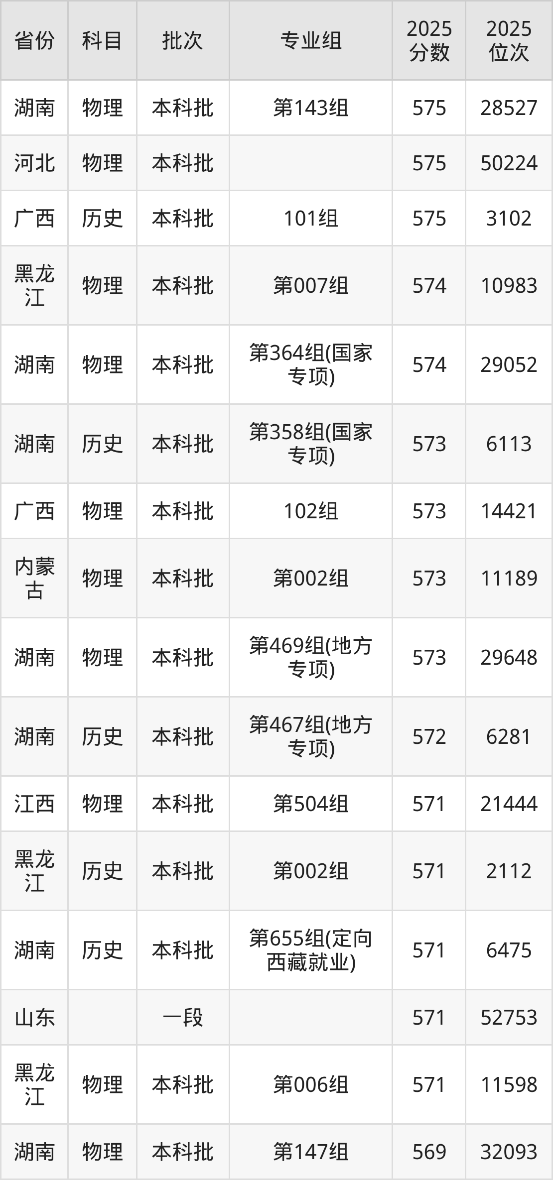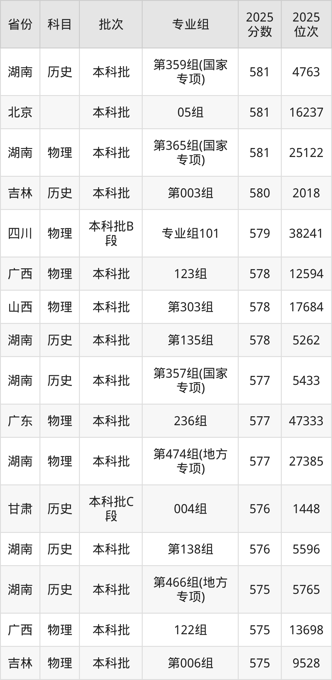 一、湖南师范大学2025年专业录取分数线