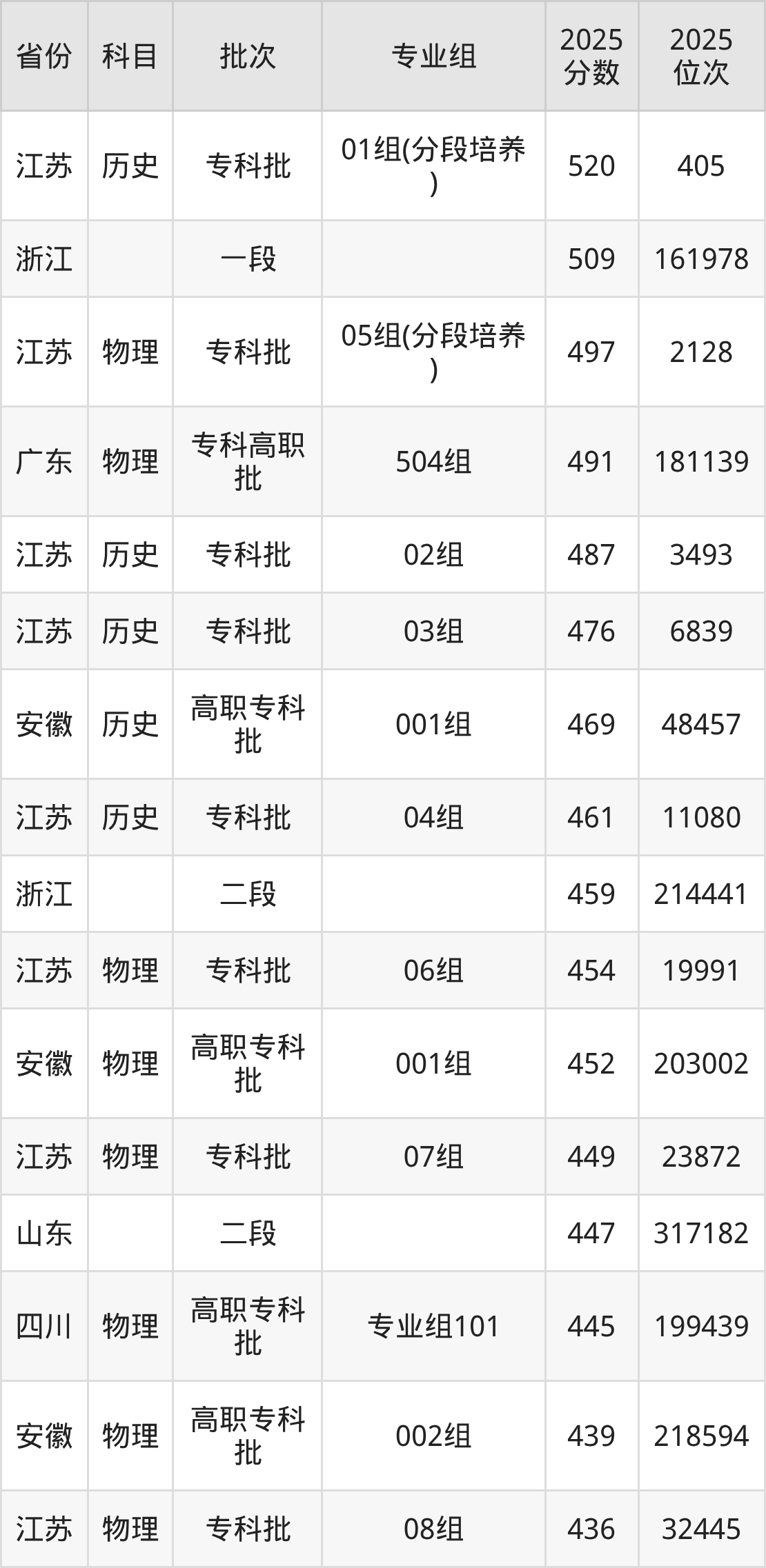 2025年江苏卫生健康职业学院各专业录取分数线从447分到495分不等,录取分数线最低的专业是临床医学;录取分数线最高的专业是中医学。本文将展示江苏卫生健康职业学院所有专业最低分数线及位次,供2026届高考生参考。