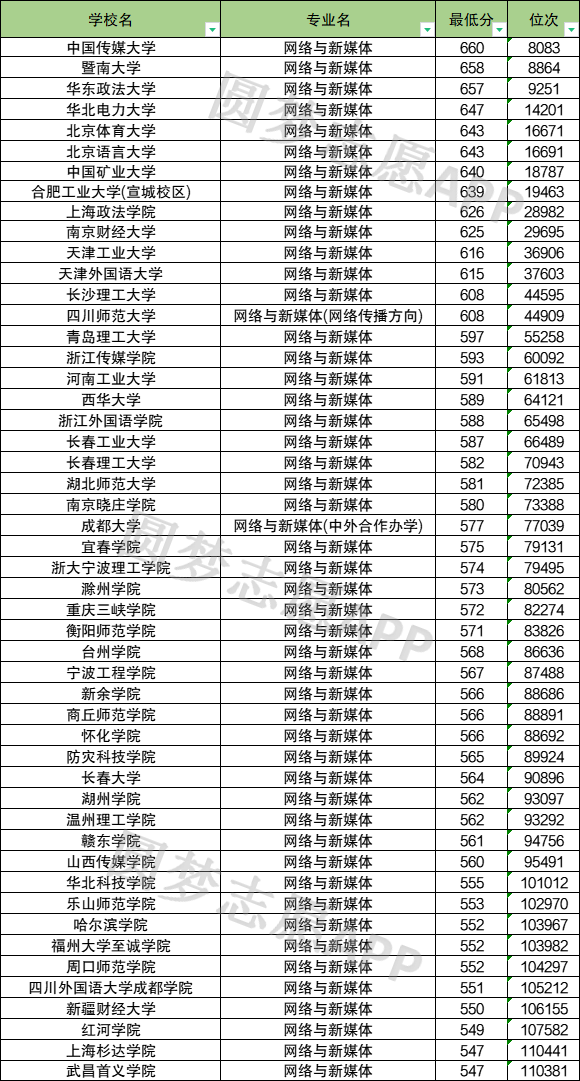 下表为网络与新媒体专业中分数线排名前50的大学名单及分数。