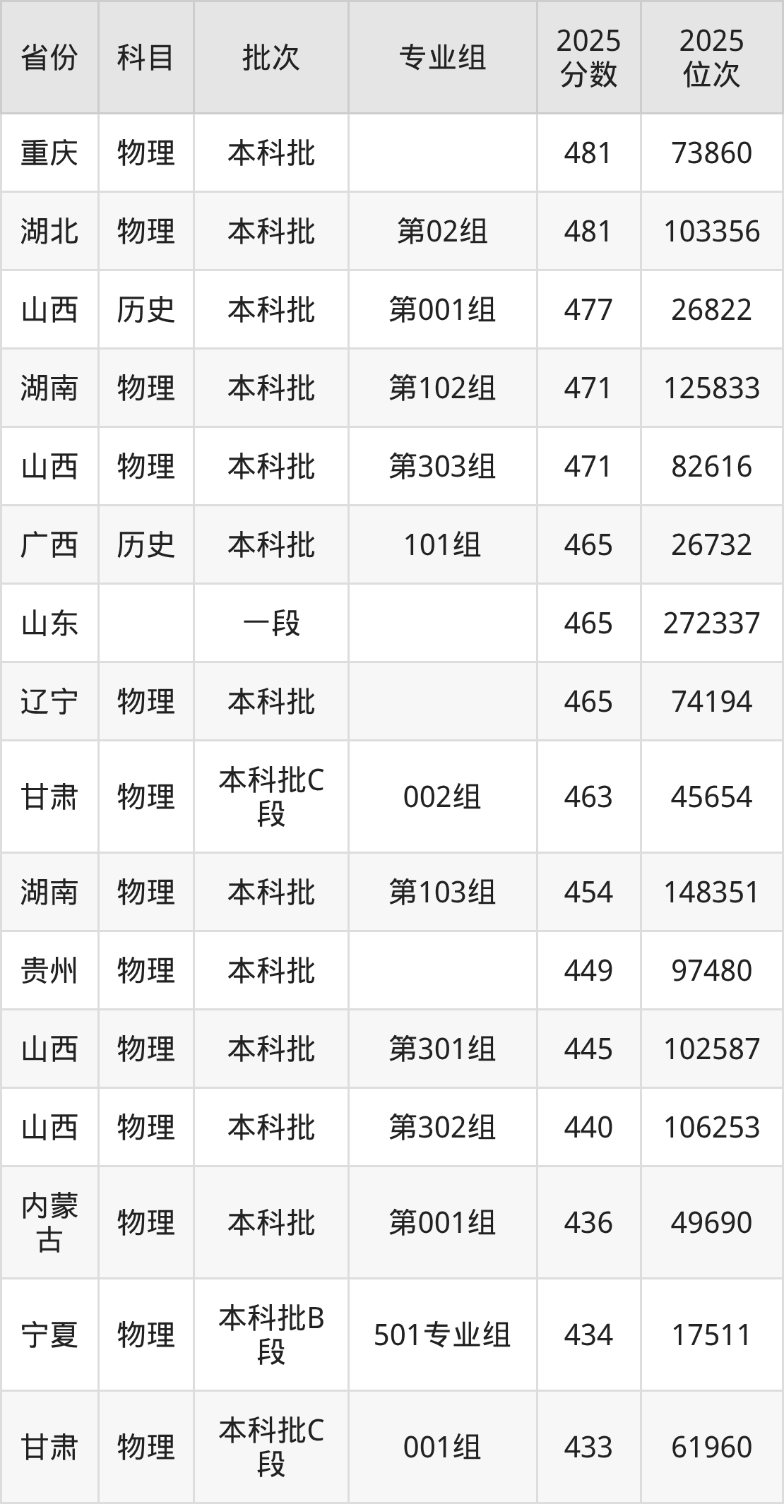 下面是2025年山西工程技术学院在全国各省录取最低分数据及位次,各位考生也可作为一个参考。