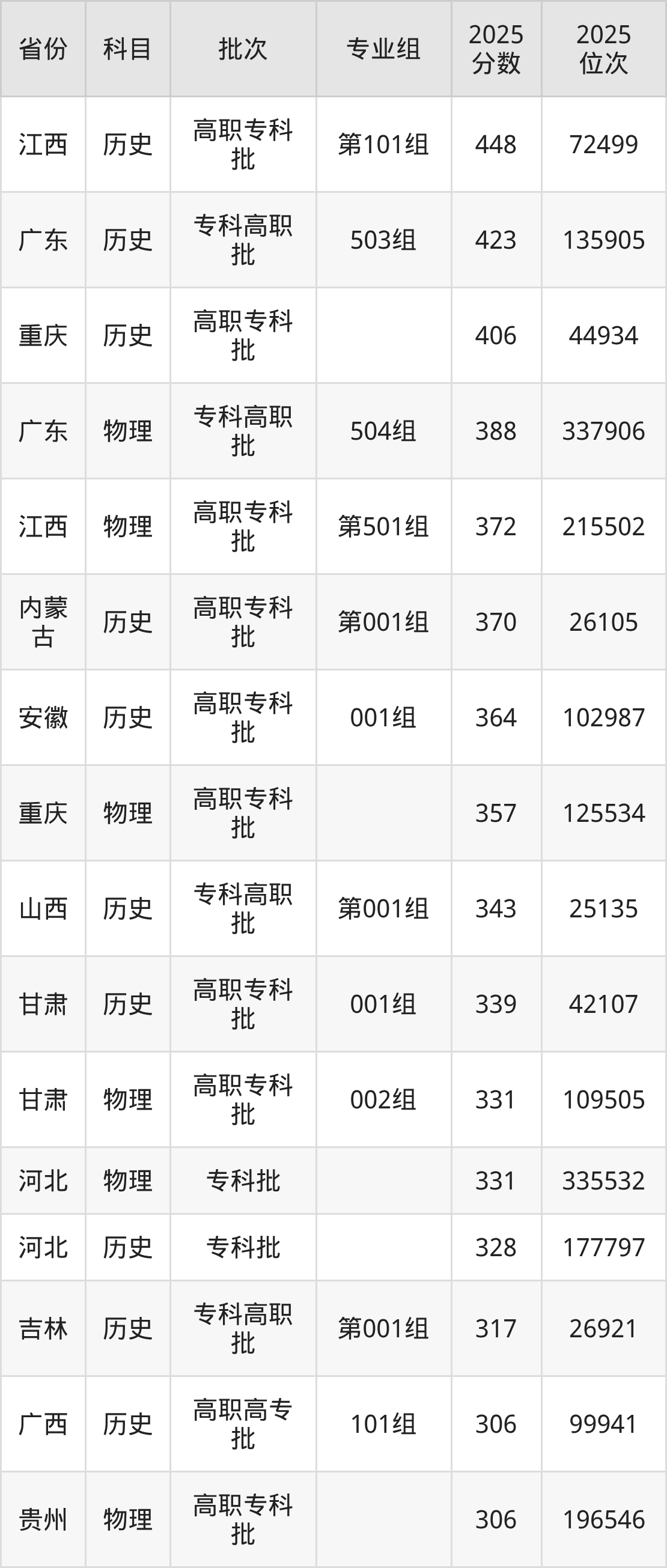 2025年伊春职业学院全国录取分数线150分到448分,录取最高在江西(第101组)、录取最低在四川(专业组101)。