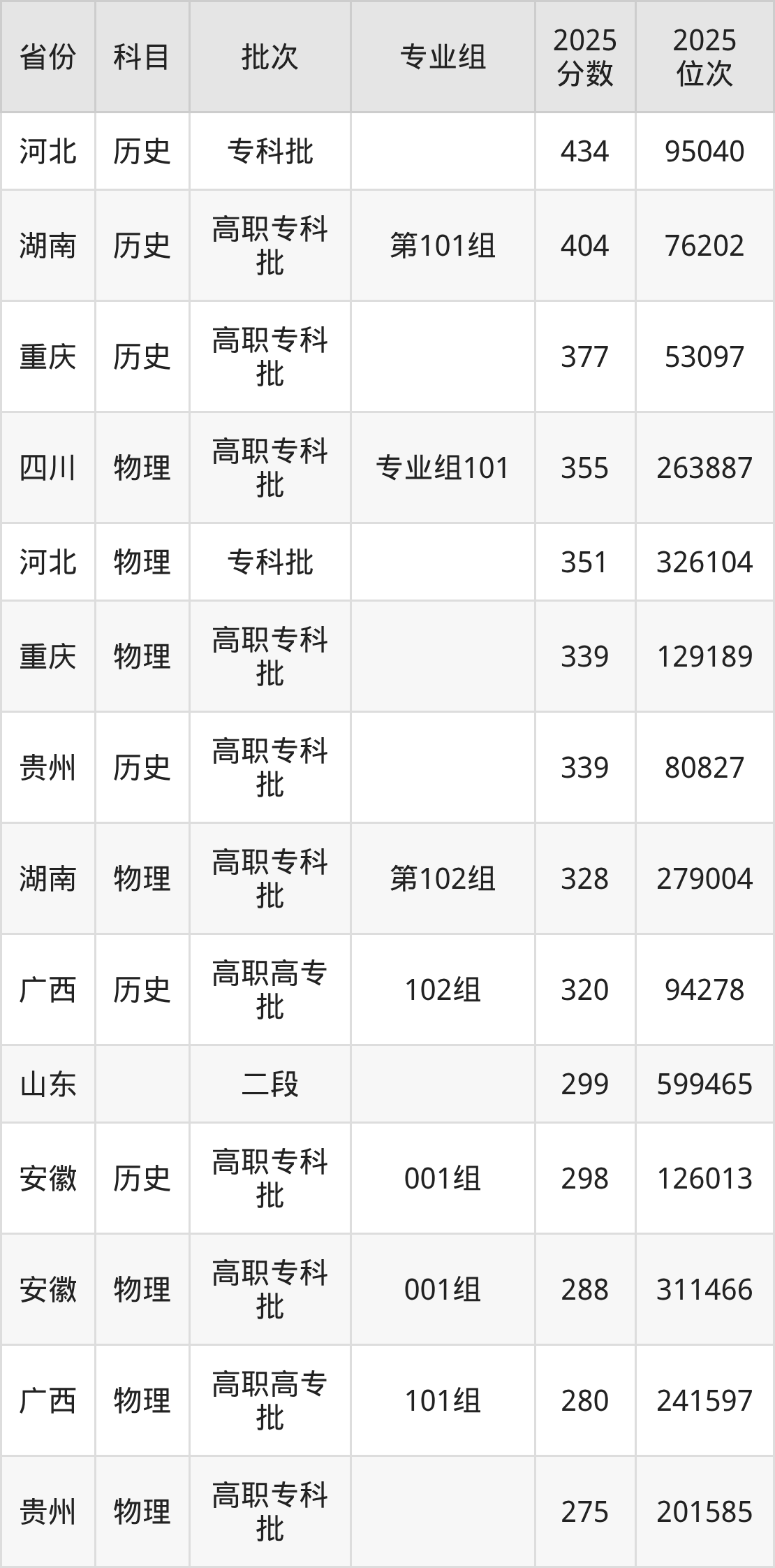 2025年贵州职业技术学院全国录取分数线275分到434分,录取最高在河北(历史)、录取最低在贵州(物理)。