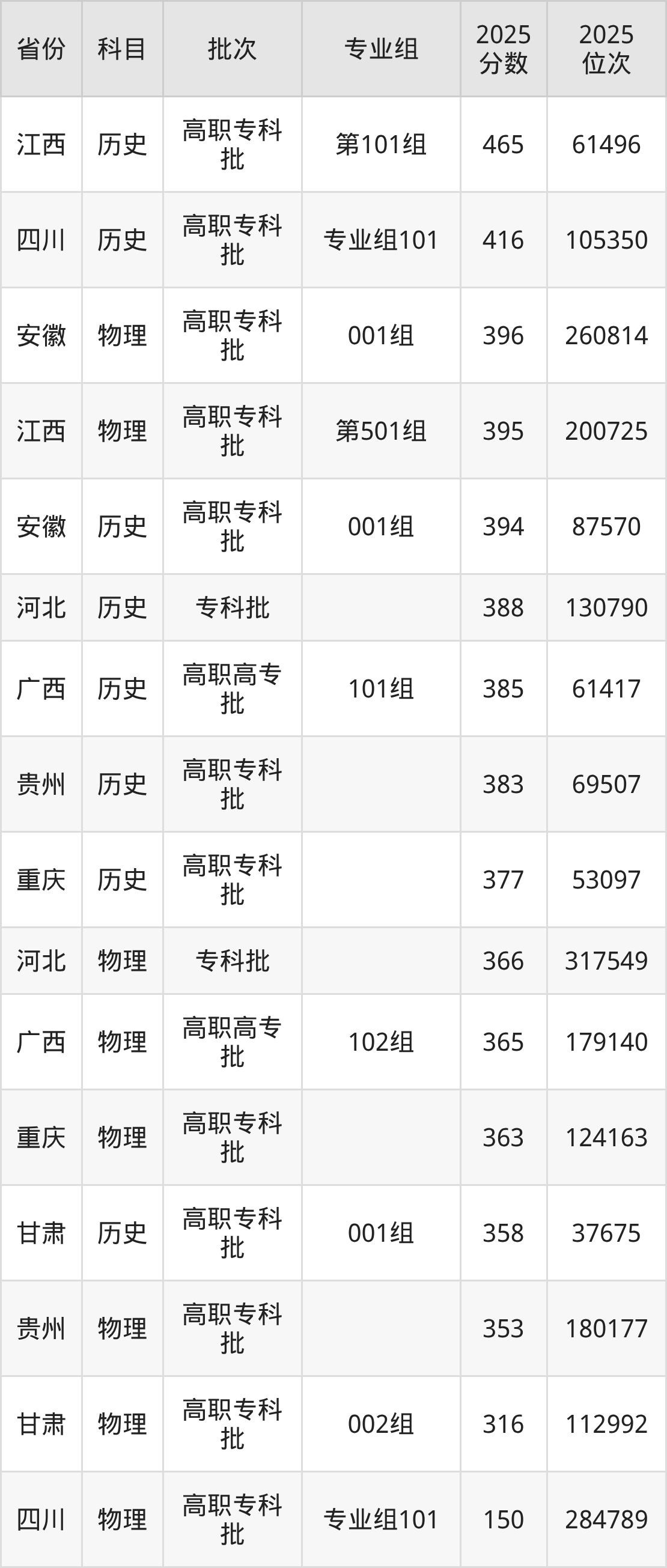 2025年云南财经职业学院全国录取分数线150分到465分,录取最高在江西(第101组)、录取最低在四川(专业组101)。