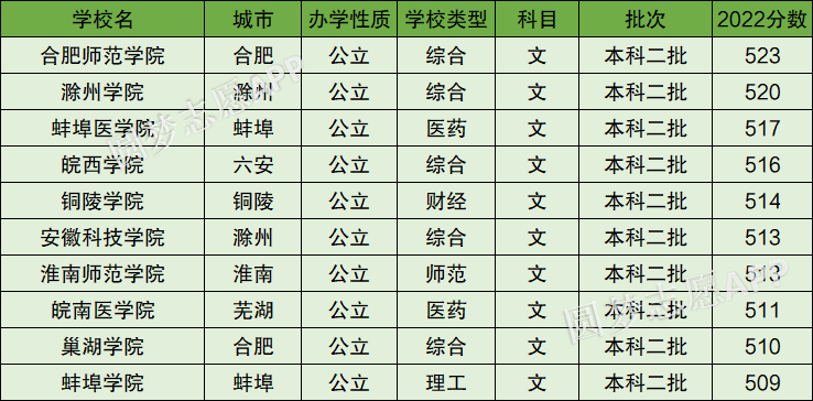 文科中分数线最高的3所二本大学包括合肥师范学院(523分)、滁州学院(520分)、蚌埠医学院(517分)