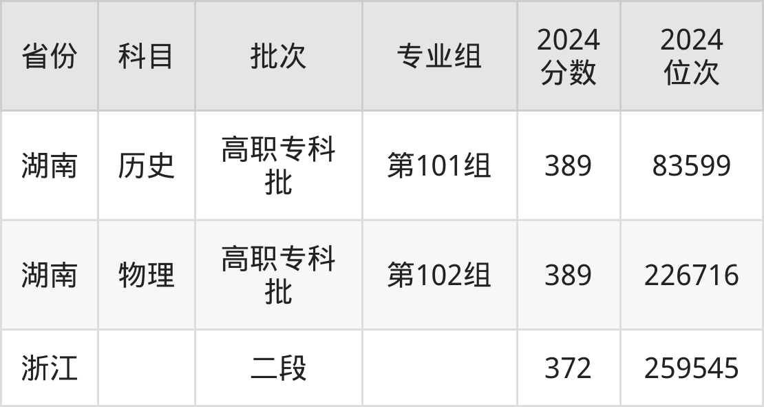 2024年湖南工艺美术职业学院全国录取分数线372分到389分,录取最高在湖南(第101组)、录取最低在浙江。