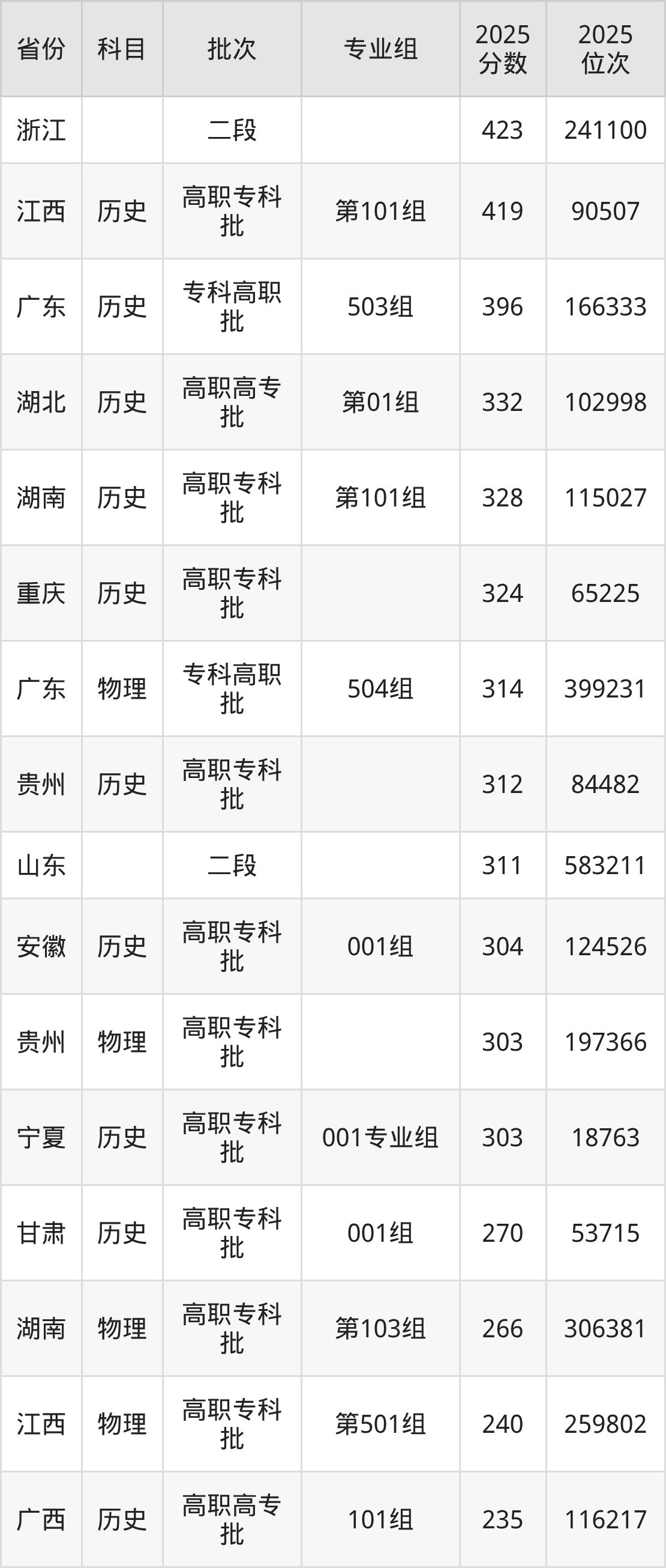 2025年宜春幼儿师范高等专科学校全国录取分数线150分到423分,录取最高在浙江、录取最低在四川(专业组101)。