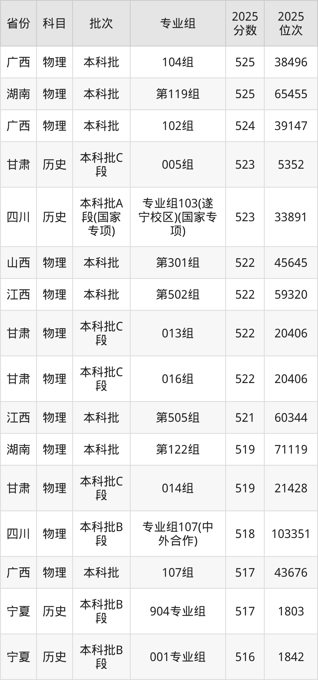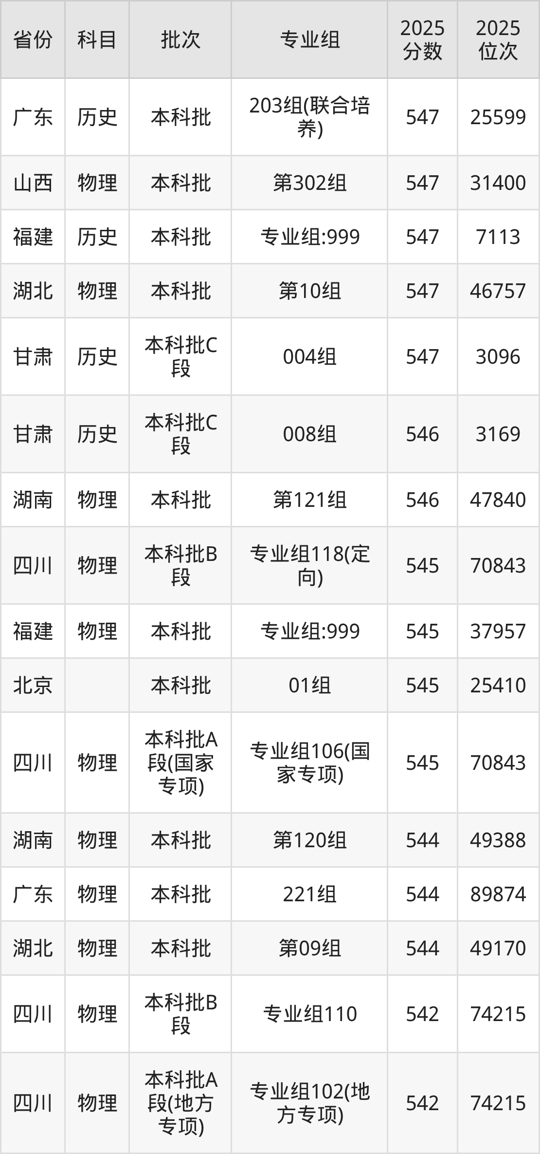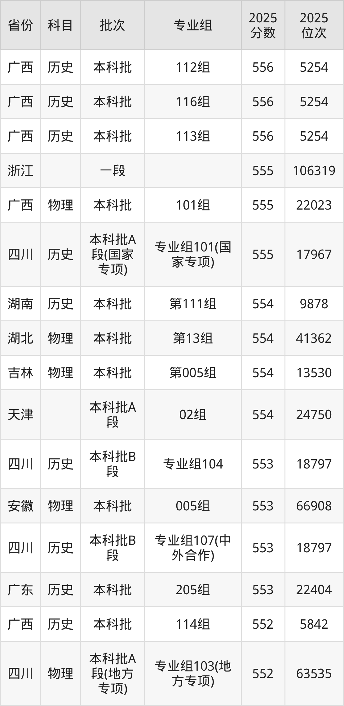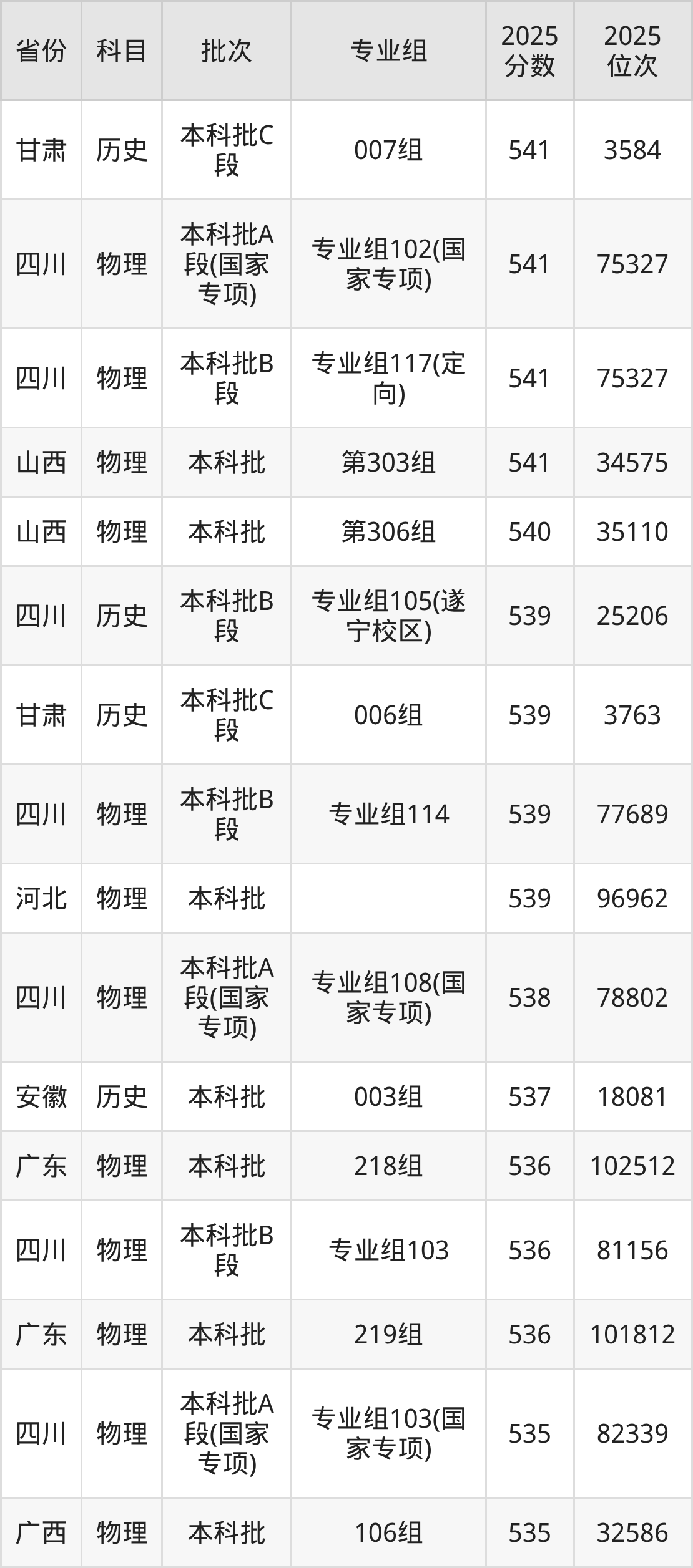 参考2025年山东省高考招录数据,按照分数线从高到低依次为大家展示四川师范大学各个专业录取分数线。