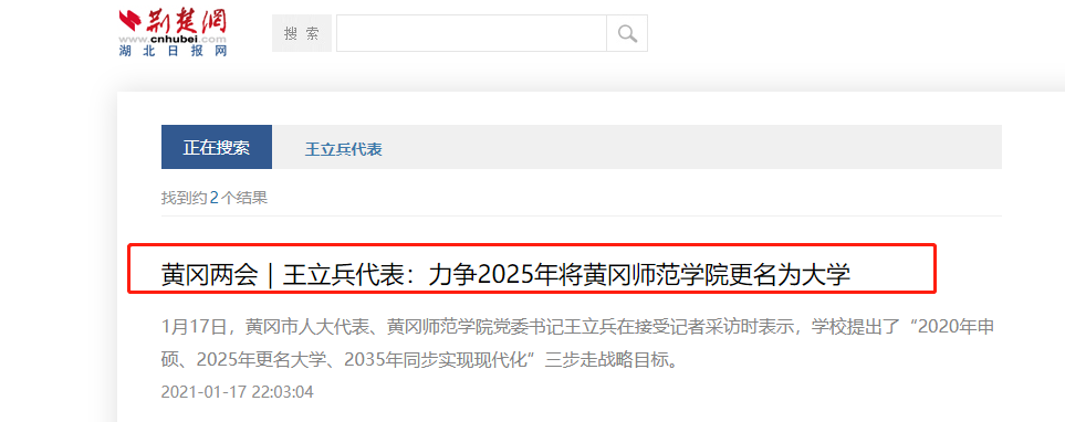 根据荆楚网2021年1月17日消息,黄冈市在政府报告中明确指出会“支持黄冈师范学院建成‘全省一流、全国知名’高水平师范大学”。黄冈市人大代表、黄冈师范学院党委书记王立兵在被采访时表示,学校现已提出“2020年申硕、2025年更名大学、2035年同步实现现代化”三步走战略目标。