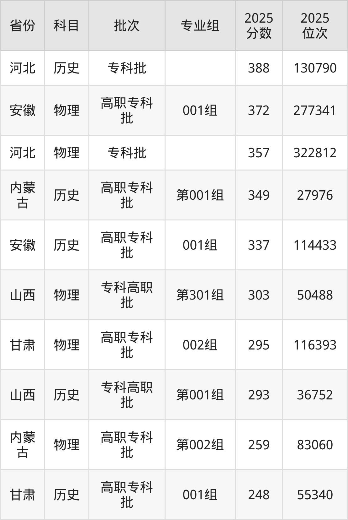 2025年河北劳动关系职业学院全国录取分数线248分到388分,录取最高在河北(历史)、录取最低在甘肃(001组)。