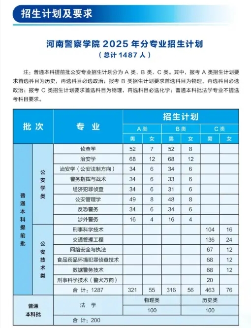 上述为2025年招生简章,2026年信息会在5-6月公布。结合河南警察学院2025年招生分数可知,本科提前批男生最低分473分、女生最低分592分。