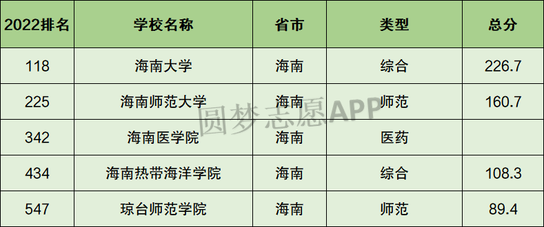 根据软科2023年中国大学总榜排名可知,海南省内有5所本科大学进入全国大学前800强,这些大学均是海南省内乃至全国都比较强的大学。具体入选名单及排名如下图: