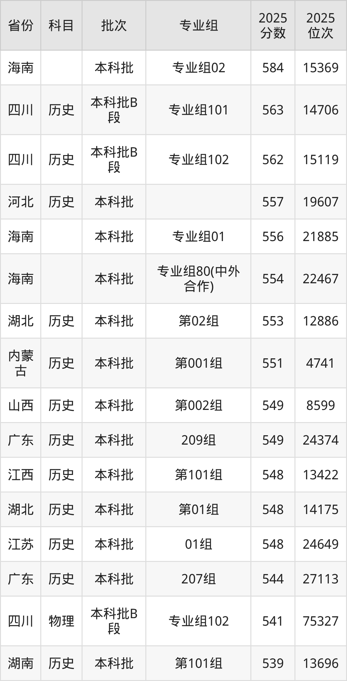 2025年云南财经大学全国录取分数线420分到584分,录取最高在海南(专业组02)、录取最低在新疆(理科)。
