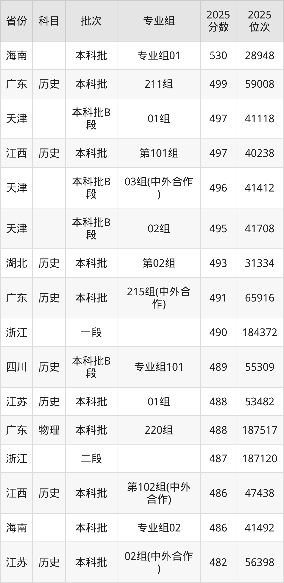 2025年吉林外国语大学全国录取分数线296分到530分,录取最高在海南(专业组01)、录取最低在新疆(理科)。