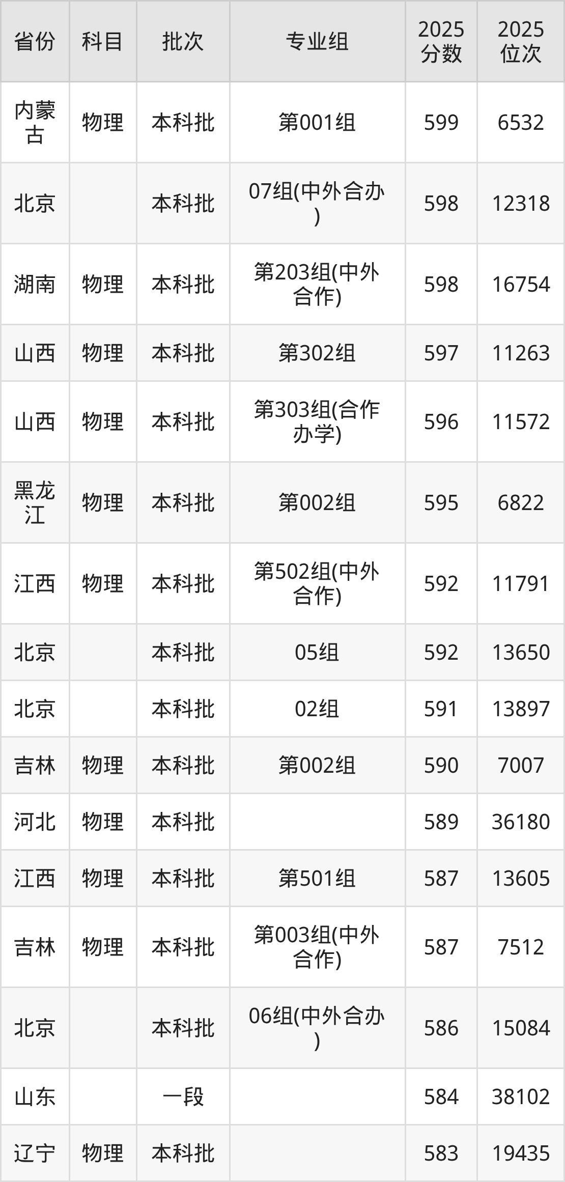 参考2025年山东省高考招录数据,按照分数线从高到低依次为大家展示北京工业大学各个专业录取分数线。