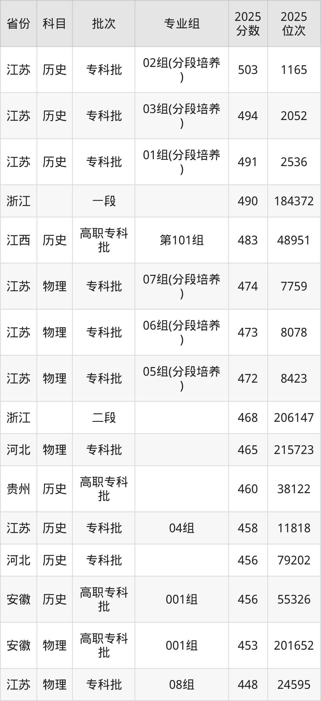 2025年南京城市职业学院全国录取分数线406分到503分,录取最高在江苏(02组(分段培养))、录取最低在贵州(物理)。