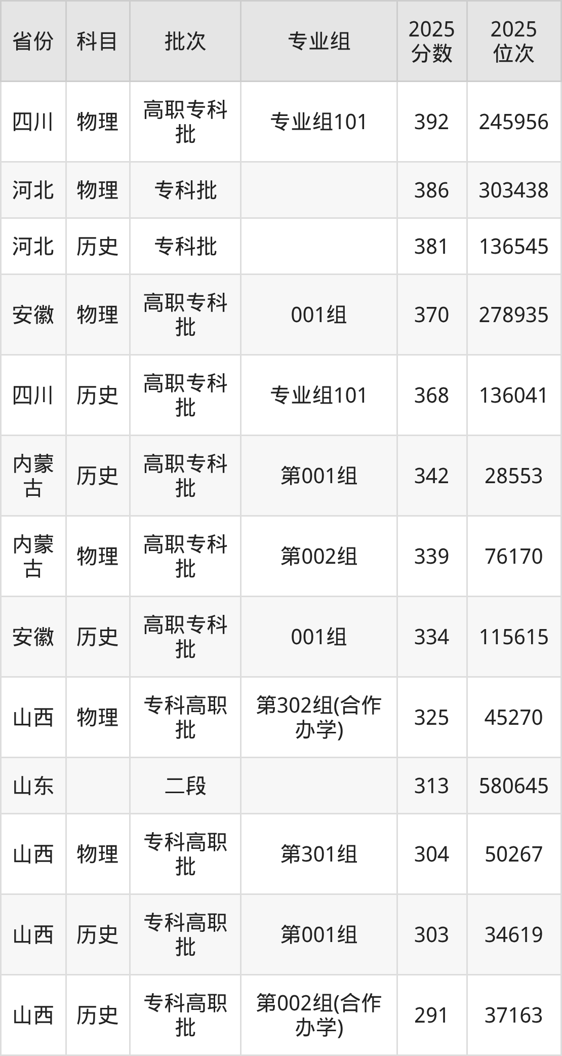 2025年东营科技职业学院全国录取分数线291分到392分,录取最高在四川(专业组101)、录取最低在山西(第002组(合作办学))。