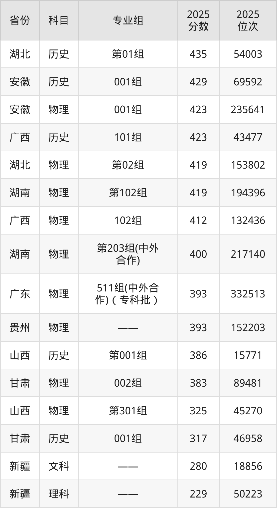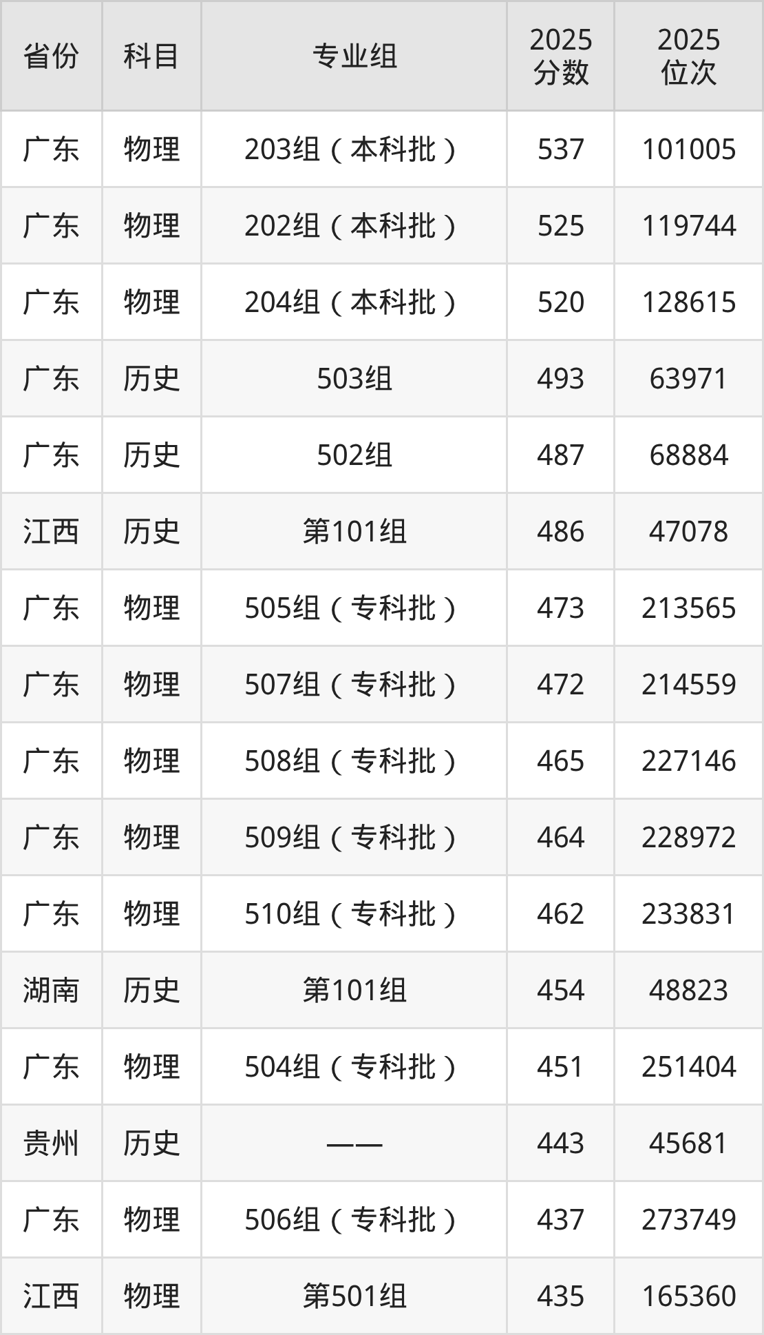 2025年广州职业技术大学全国录取分数线229分到537分,录取最高在广东(物理类203组)、录取最低在新疆(理科)。