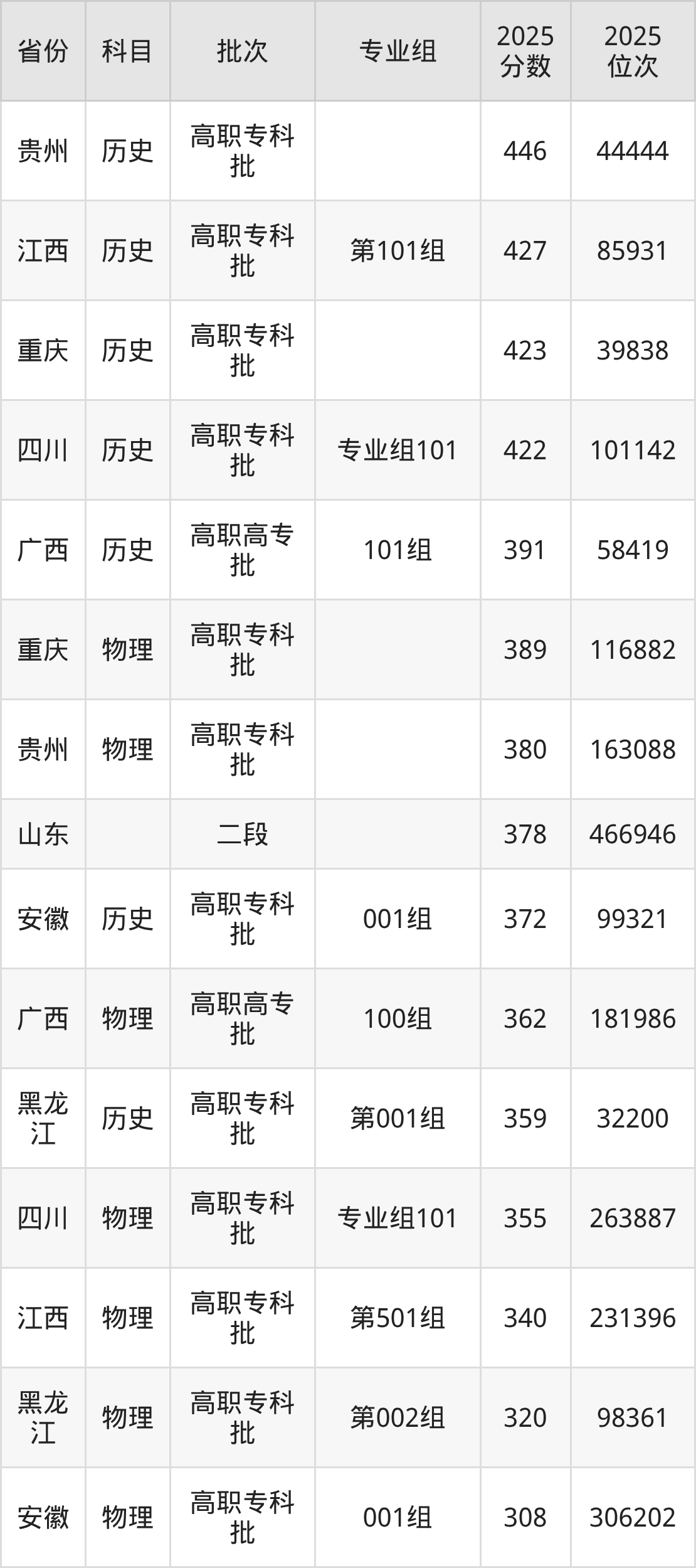 2025年大理护理职业学院全国录取分数线308分到446分,录取最高在贵州(历史)、录取最低在安徽(001组)。