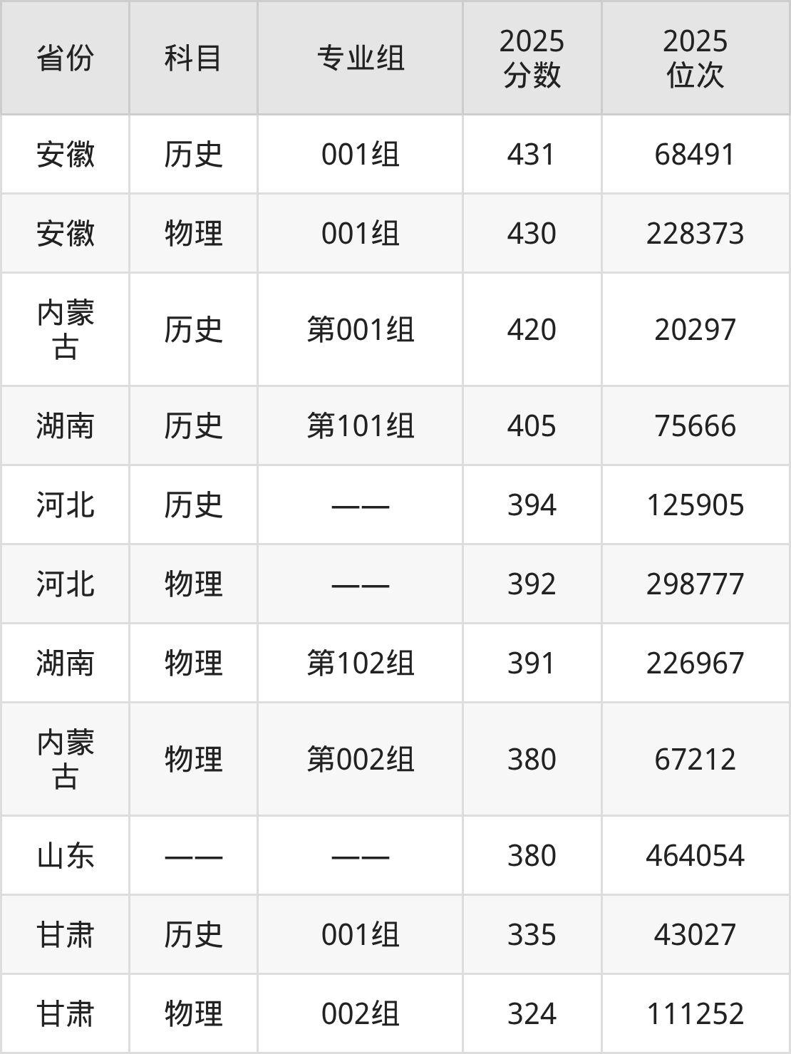2025年河南农业职业学院全国录取分数线324分到431分,录取最高在安徽(历史类001组)、录取最低在甘肃(物理类002组)。