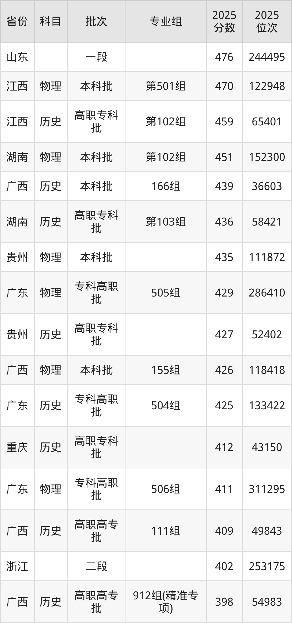 参考2025年山东省高考招录数据,按照分数线从高到低依次为大家展示南宁职业技术大学各个专业录取分数线。