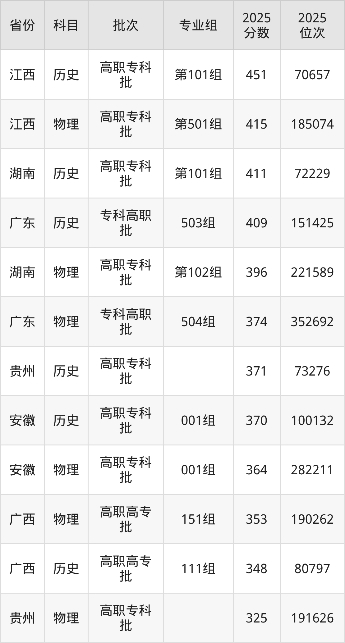 2025年湖南生物机电职业技术学院全国录取分数线325分到451分,录取最高在江西(第101组)、录取最低在贵州(物理)。
