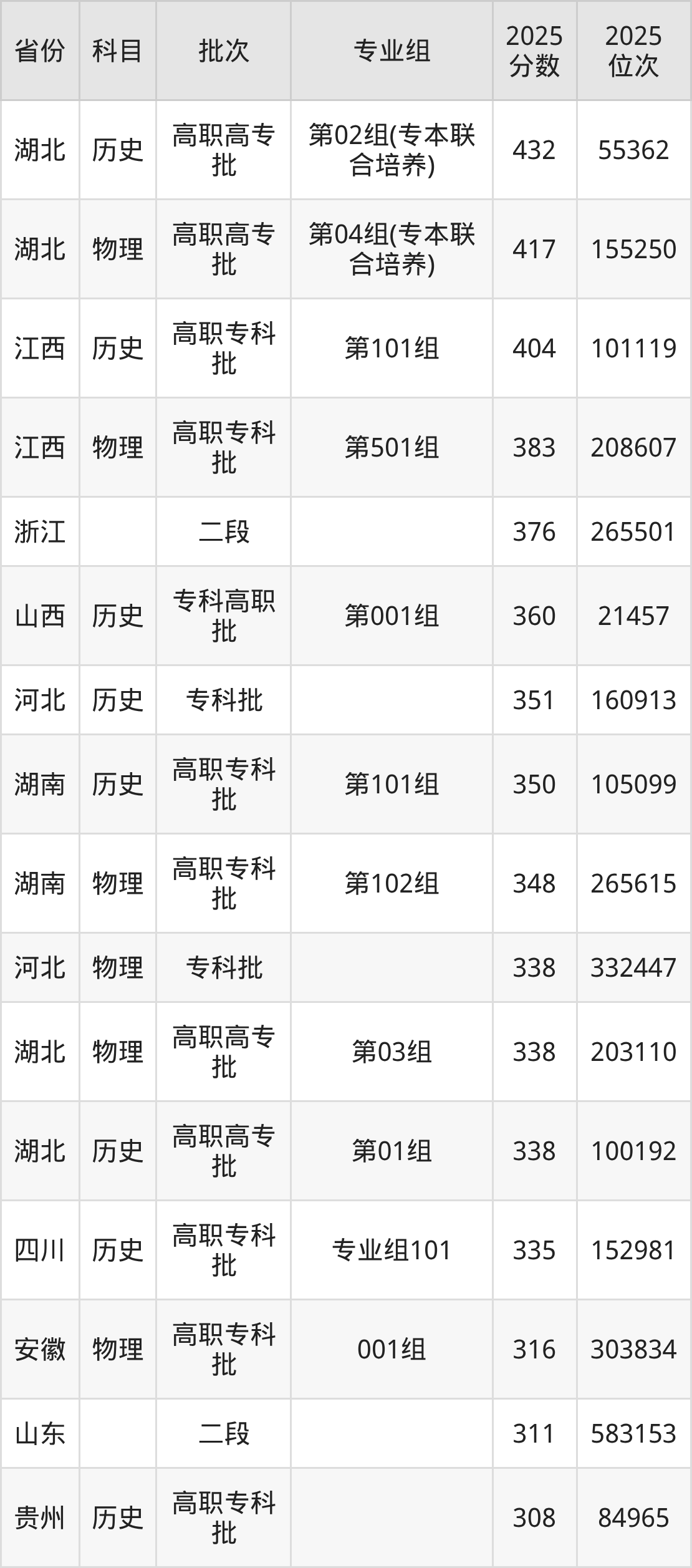 2025年武汉信息传播职业技术学院全国录取分数线150分到432分,录取最高在湖北(第02组(专本联合培养))、录取最低在四川(专业组101)。