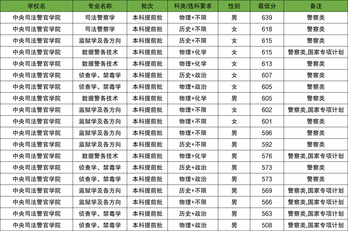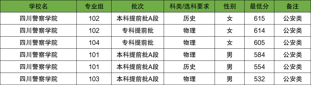 2025年四川警校录取分数线如下:四川警察学院男生最低分532分,女生最低分605分;中国刑事警察学院男生最低分544分,女生最低分627分。