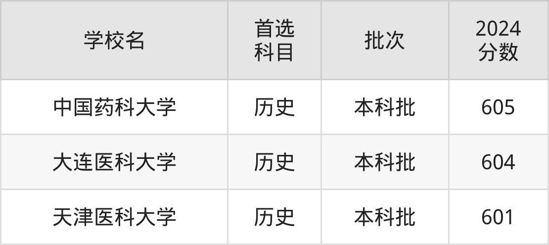 首选历史科目考生能上的有3所,全部在本科批次录取。具体有:中国药科大学(605分)、大连医科大学(604分)、天津医科大学(601分)。