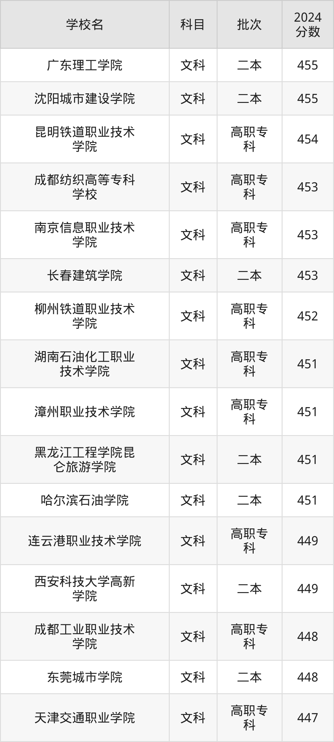 文科科目考生能上的有19所,包括7所本科医科大学和12所专科医科大学。具体有:广东理工学院(455分)、沈阳城市建设学院(455分)、昆明铁道职业技术学院(454分)、成都纺织高等专科学校(453分)等;