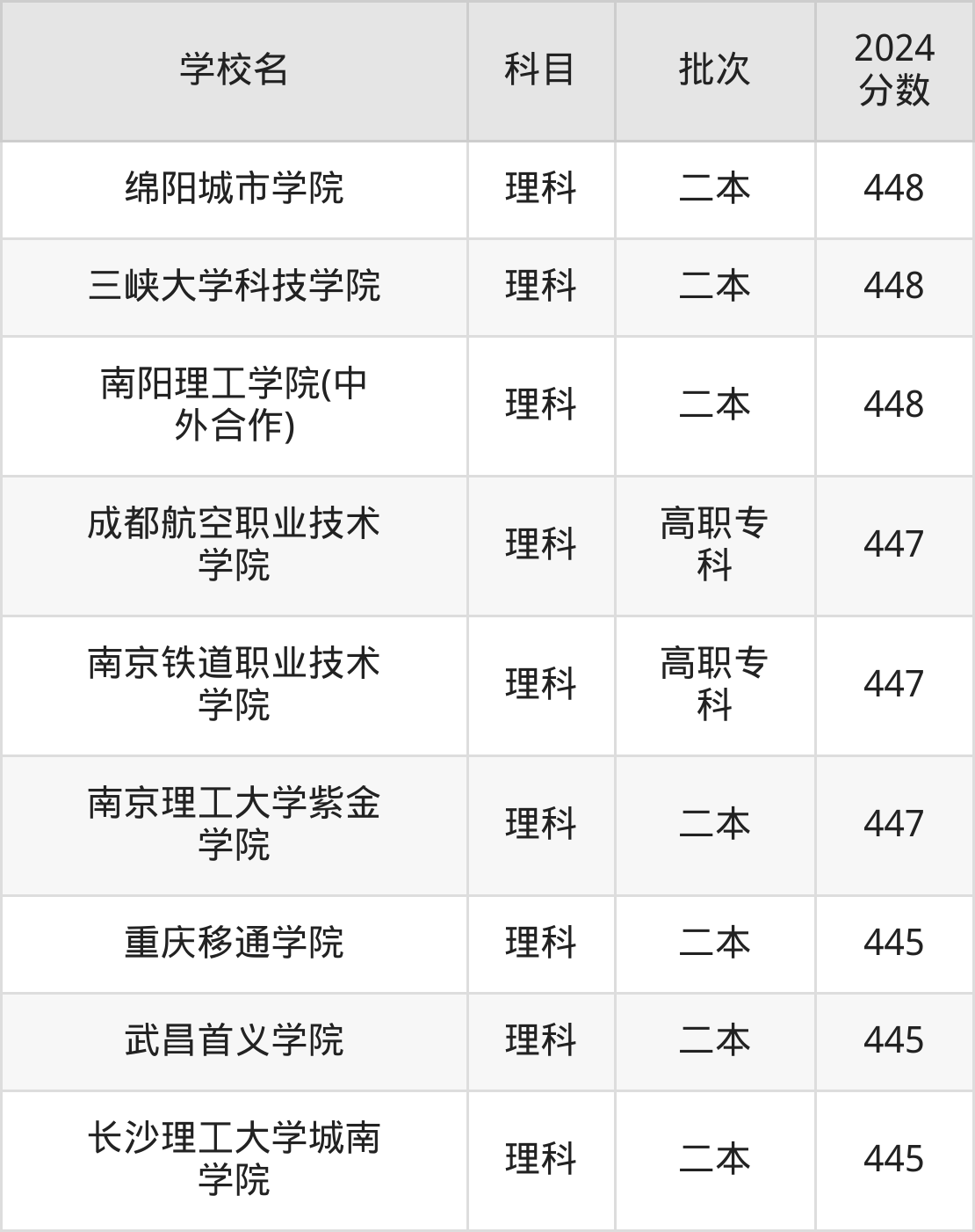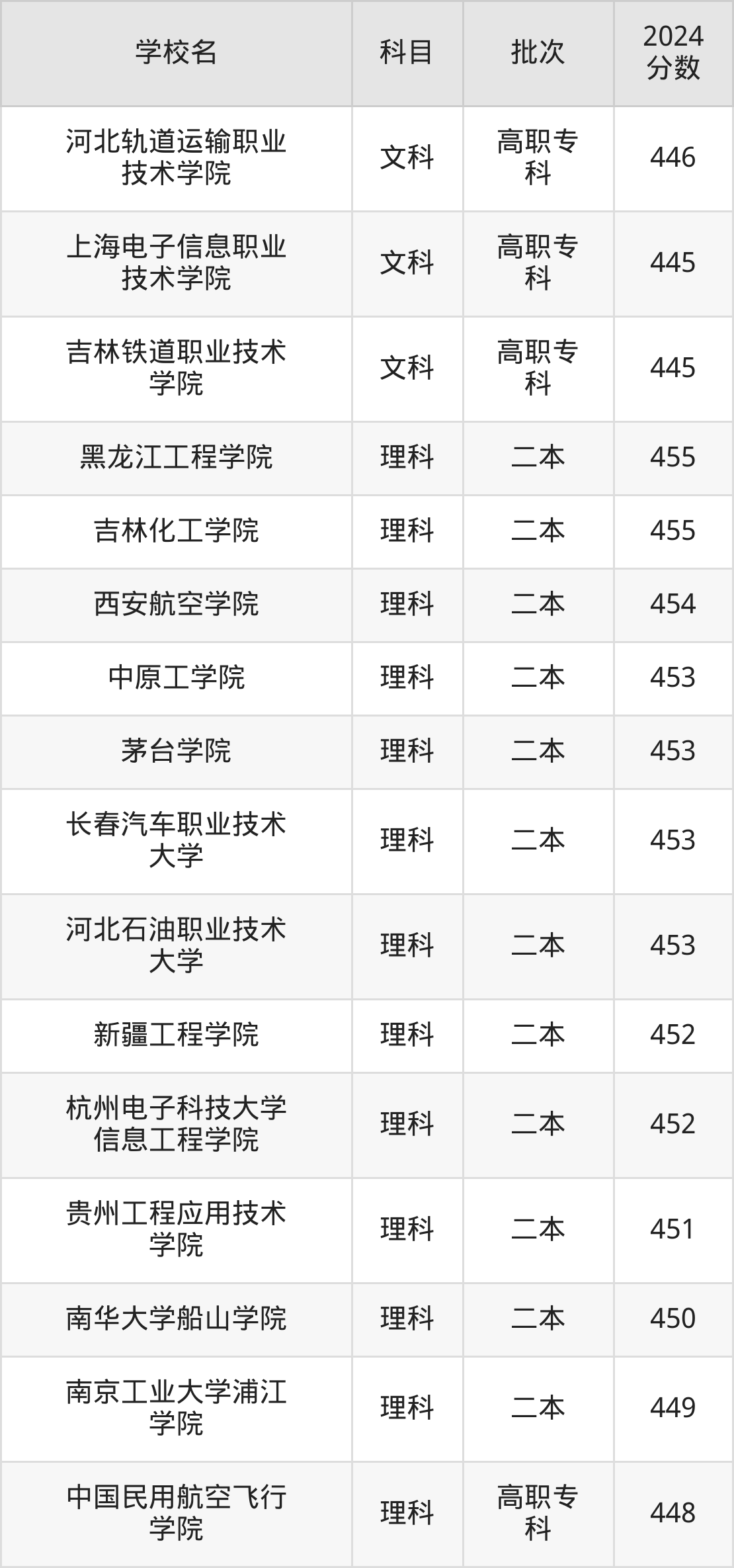 为给各位考生更加详细的参考,下文整理了2024年录取分数线在445分到455分之间的理工类大学名单汇总。