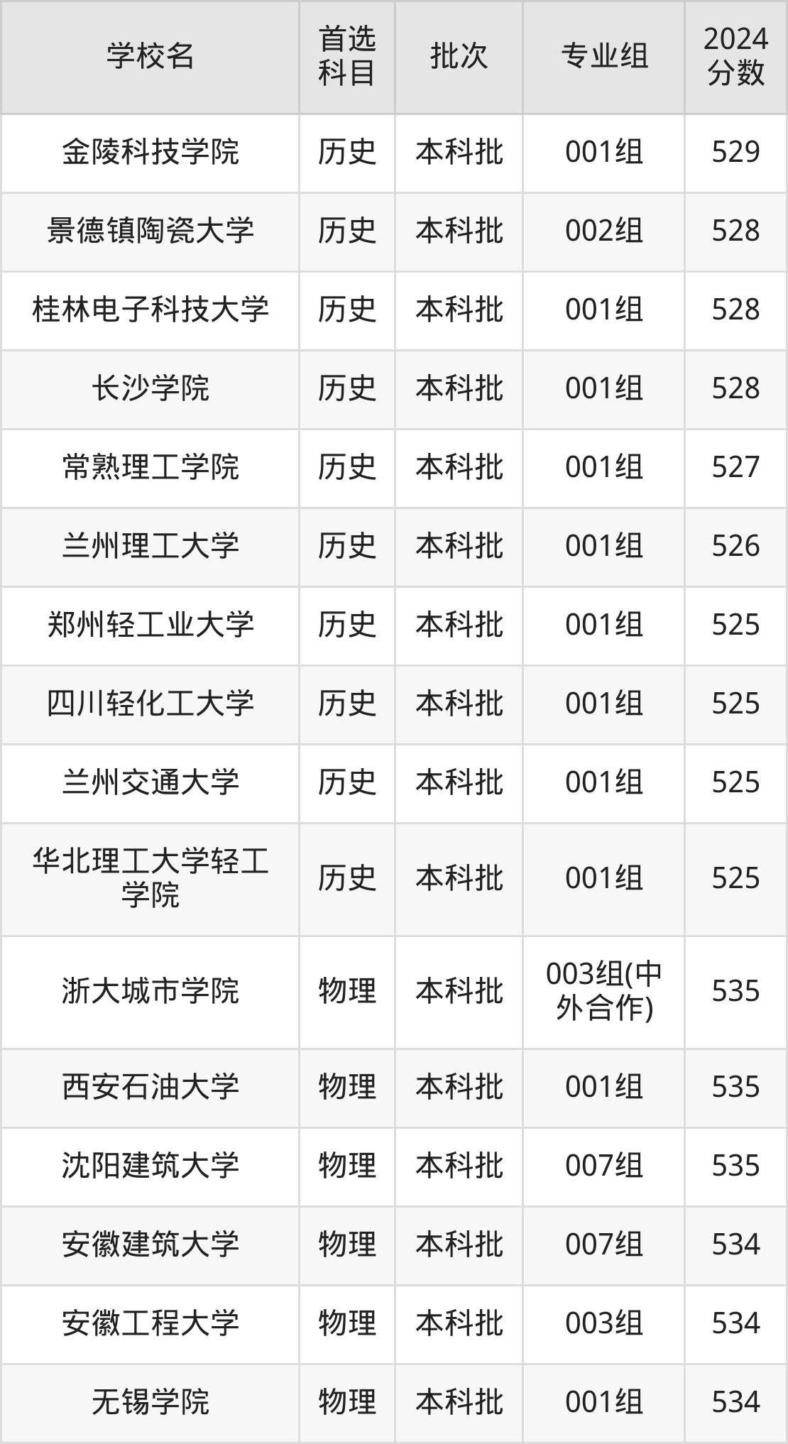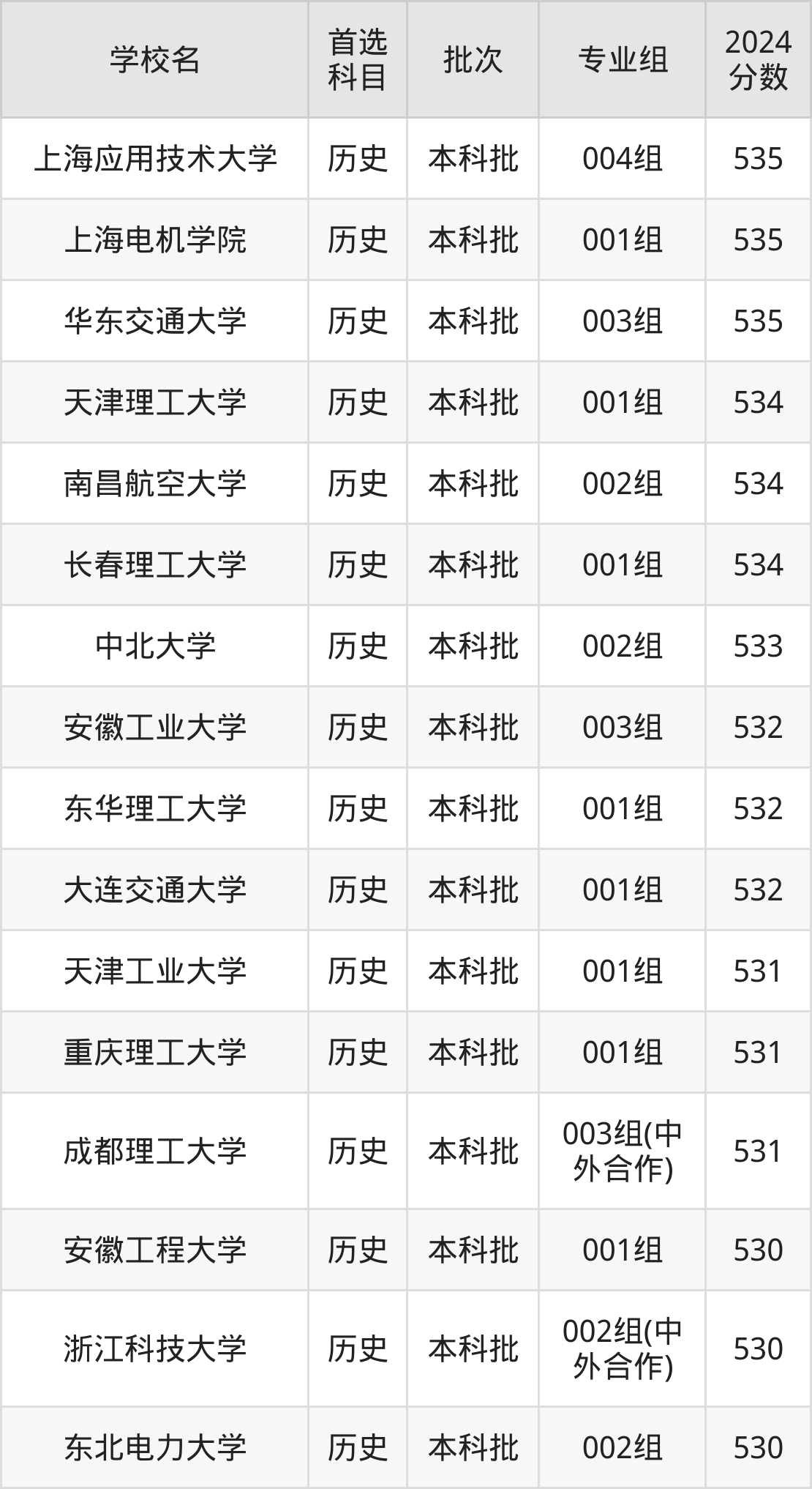 首选历史科目考生能上的有26所,全部在本科批次录取。具体有:上海应用技术大学004组(535分)、上海电机学院001组(535分)、华东交通大学003组(535分)、天津理工大学001组(534分)等;