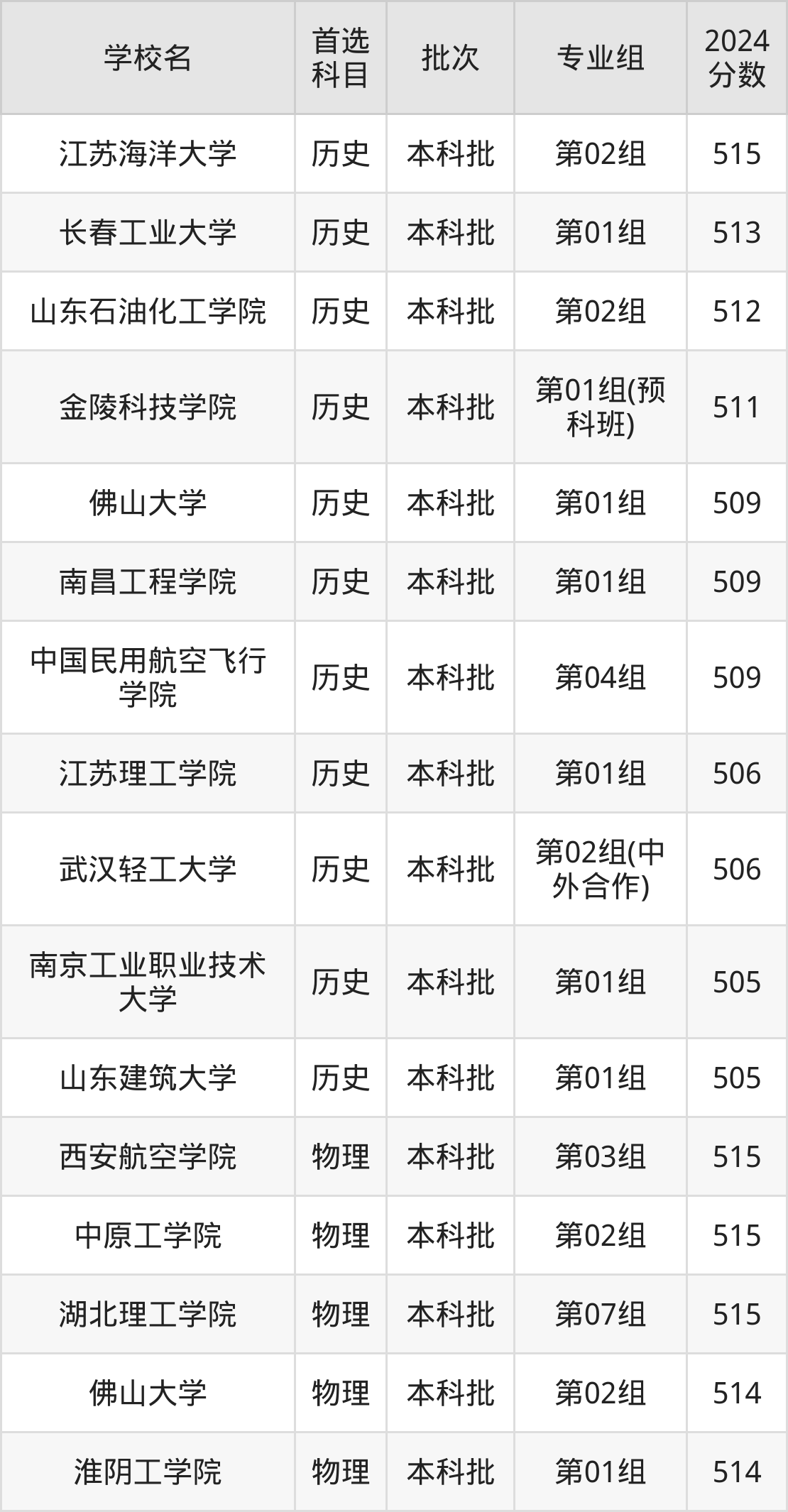 首选历史科目考生能上的有11所,全部在本科批次录取。具体有:江苏海洋大学第02组(515分)、长春工业大学第01组(513分)、山东石油化工学院第02组(512分)、金陵科技学院第01组(预科班)(511分)等;