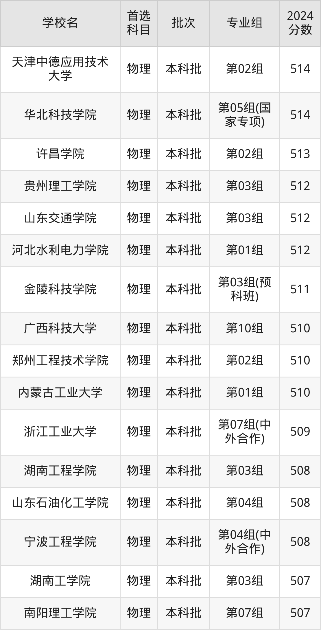 首选物理科目考生能上的有24所,全部在本科批次录取。具体有:西安航空学院第03组(515分)、中原工学院第02组(515分)、湖北理工学院第07组(515分)、佛山大学第02组(514分)等。