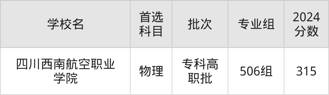 首选物理科目考生能上的有1所,全部在专科批次录取。具体有:四川西南航空职业学院506组(315分)。