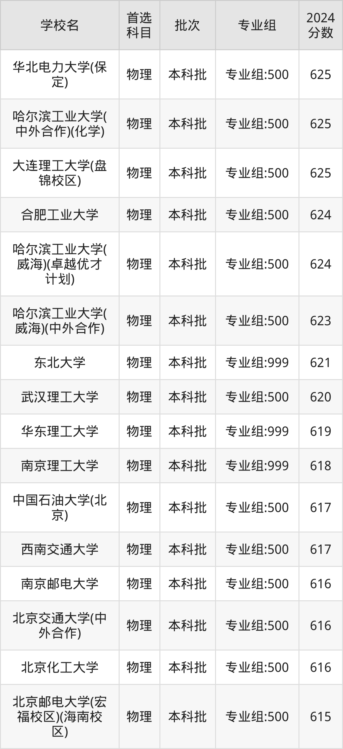 首选物理科目考生能上的有16所,全部在本科批次录取。具体有:华北电力大学(保定)专业组:500(625分)、哈尔滨工业大学(中外合作)(化学)专业组:500(625分)、大连理工大学(盘锦校区)专业组:500(625分)、合肥工业大学专业组:500(624分)等;
