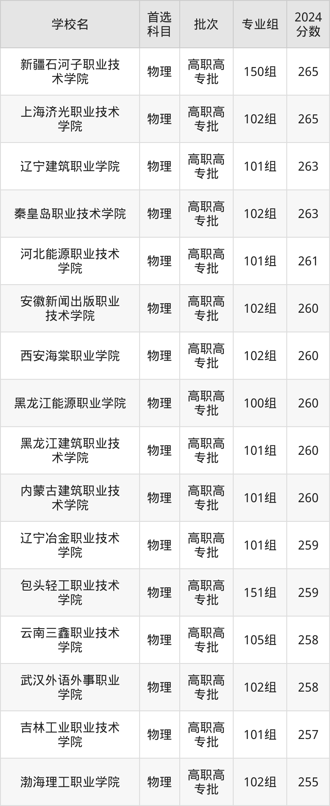 首选物理科目考生能上的有17所,全部在专科批次录取。具体有:新疆石河子职业技术学院150组(265分)、上海济光职业技术学院102组(265分)、辽宁建筑职业学院101组(263分)、秦皇岛职业技术学院102组(263分)等;