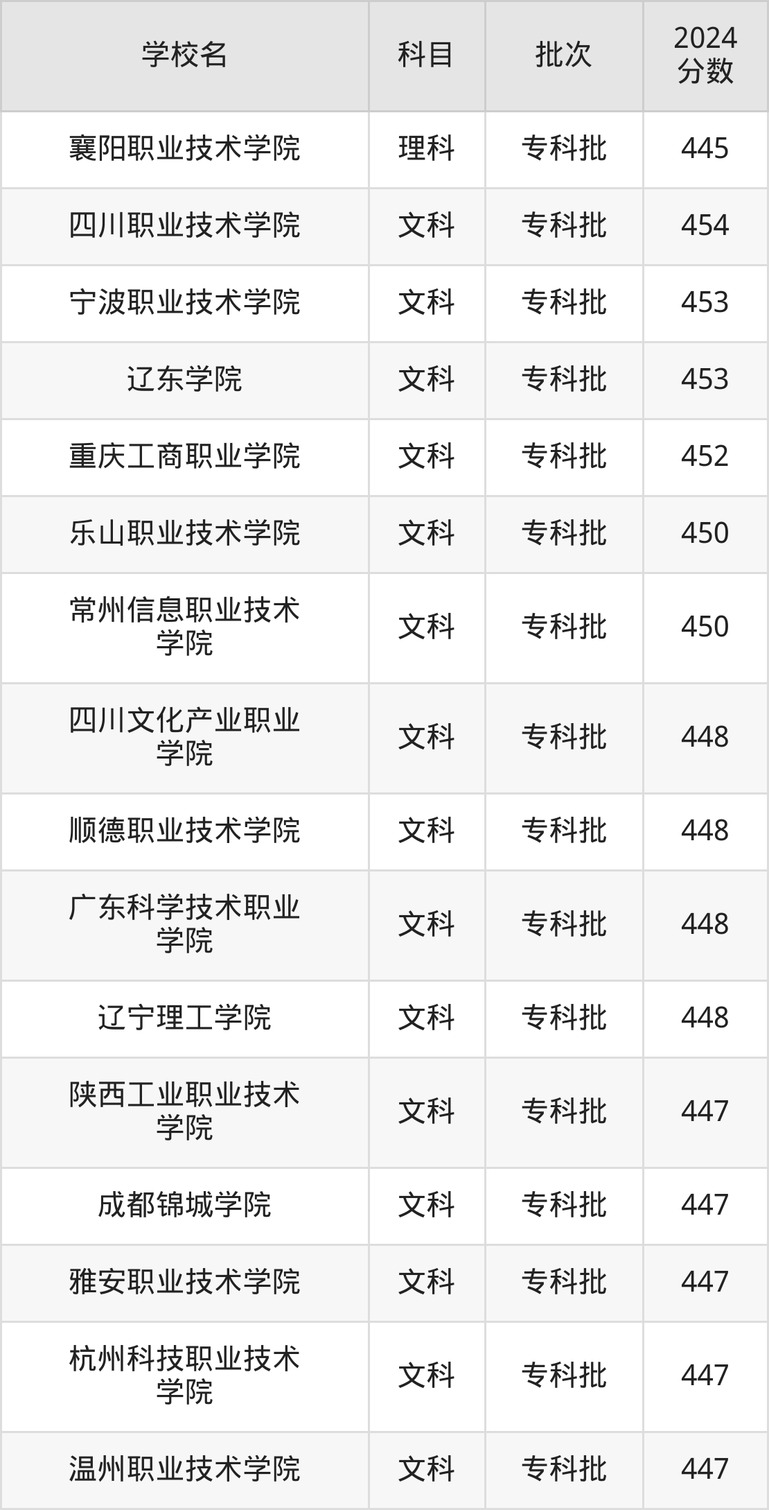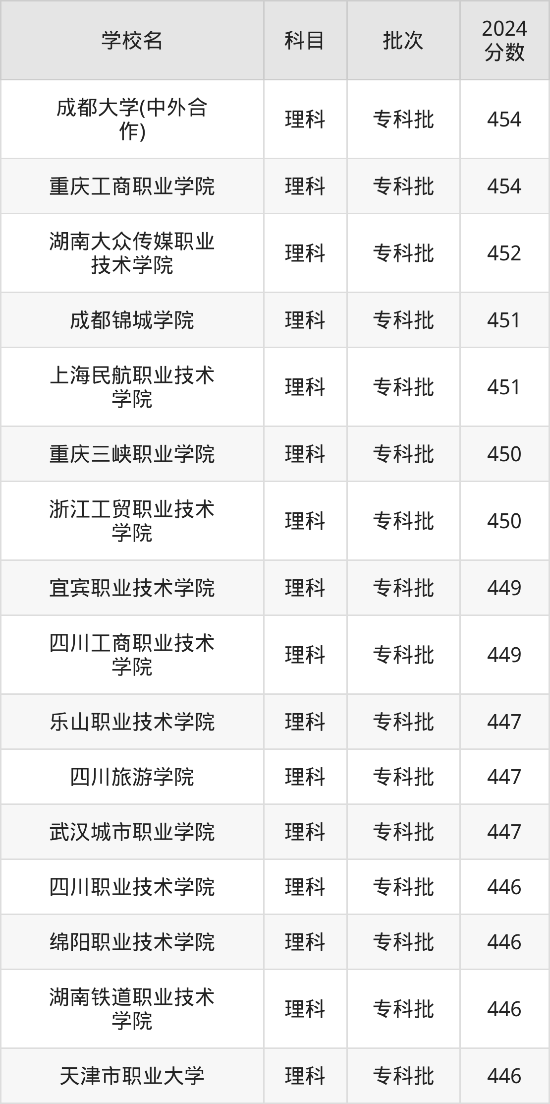 根据2024年高考招录数据,录取分数线刚好为450分的综合类大学有重庆三峡职业学院、浙江工贸职业技术学院、乐山职业技术学院。下面是这些学校的相关介绍: