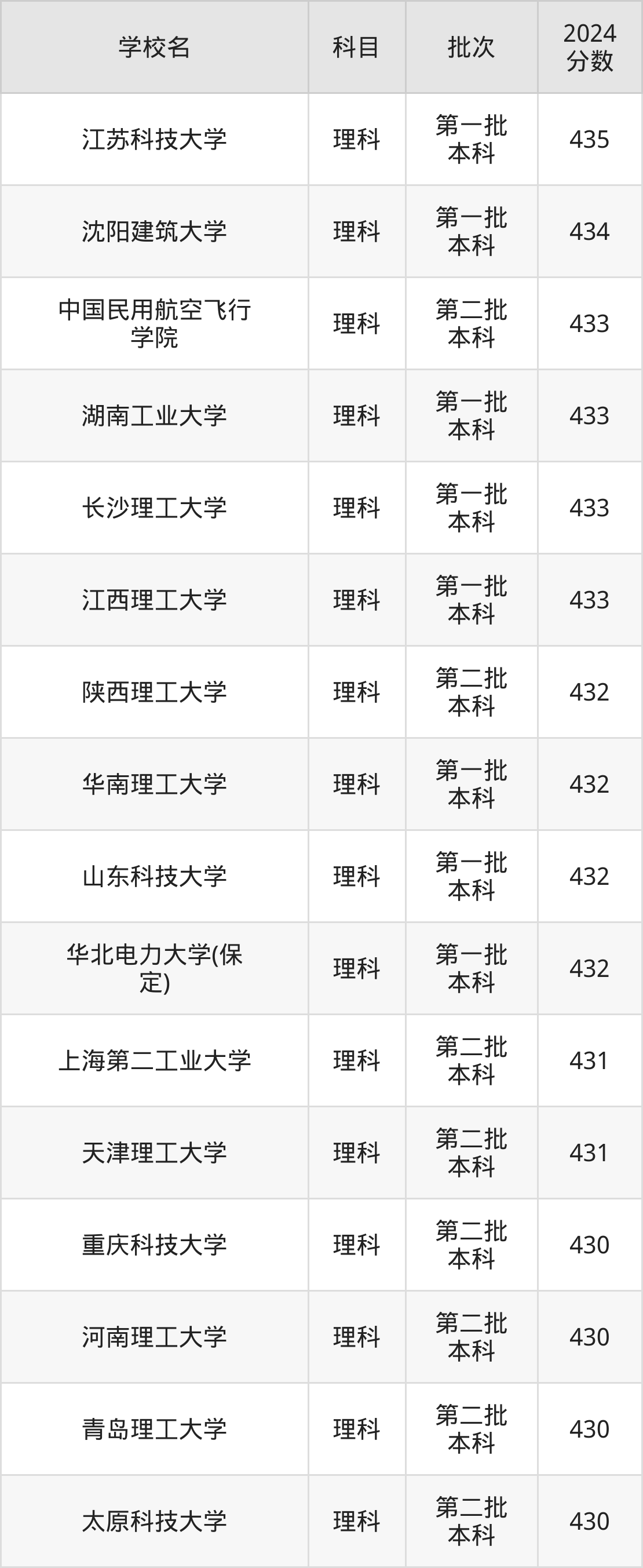 理科科目考生能上的有28所,全部在本科批次录取。具体有:江苏科技大学(435分)、沈阳建筑大学(434分)、中国民用航空飞行学院(433分)、湖南工业大学(433分)等;