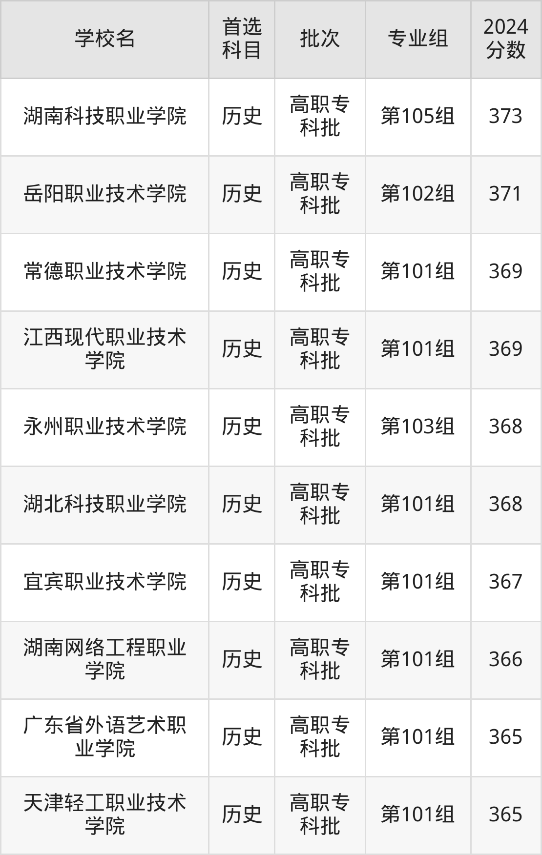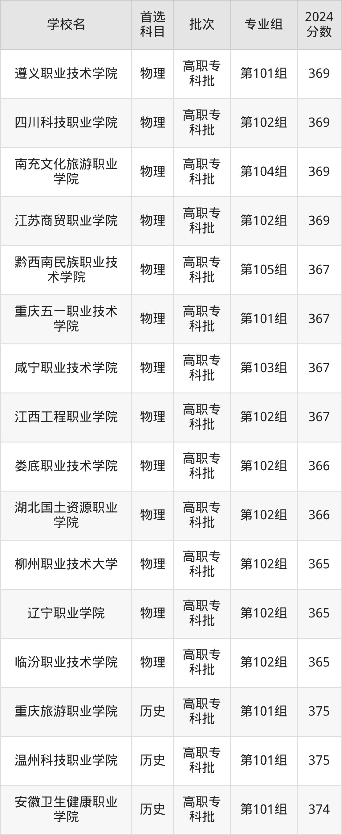 首选历史科目考生能上的有13所,全部在专科批次录取。具体有:重庆旅游职业学院第101组(375分)、温州科技职业学院第101组(375分)、安徽卫生健康职业学院第101组(374分)、湖南科技职业学院第105组(373分)等。
