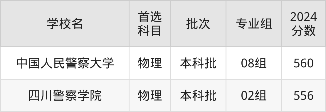 首选物理科目考生能上的有2所,全部在本科批次录取。具体有:中国人民警察大学08组(560分)、四川警察学院02组(556分)。