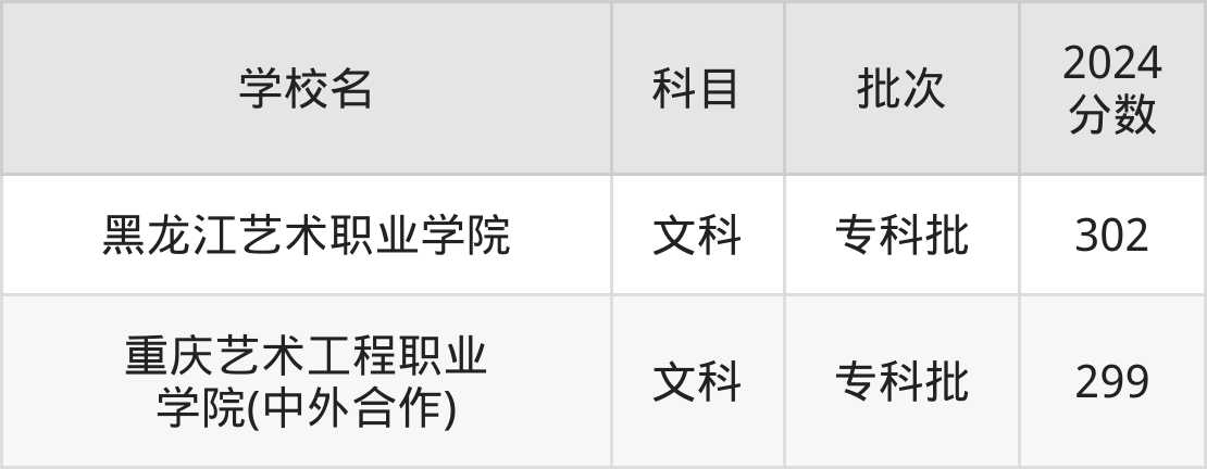 文科科目考生能上的有2所,全部在专科批次录取。具体有:黑龙江艺术职业学院(302分)、重庆艺术工程职业学院(中外合作)(299分)。
